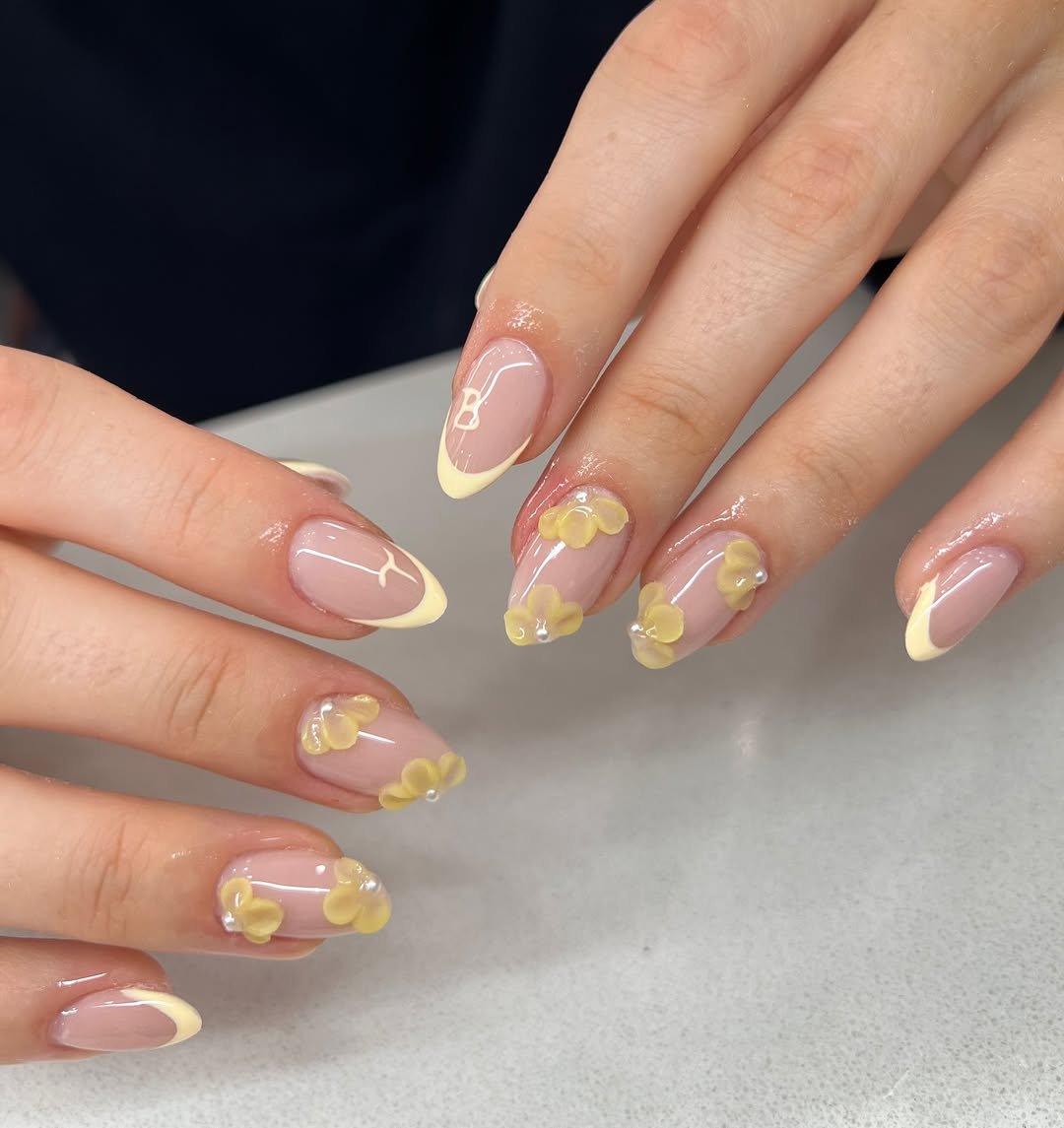 This set feels like a soft summer morning bottled into a manicure. The buttery yellow French tips keep things fresh and cheerful, while the delicate 3D floral accents add that sweet, garden-inspired touch.