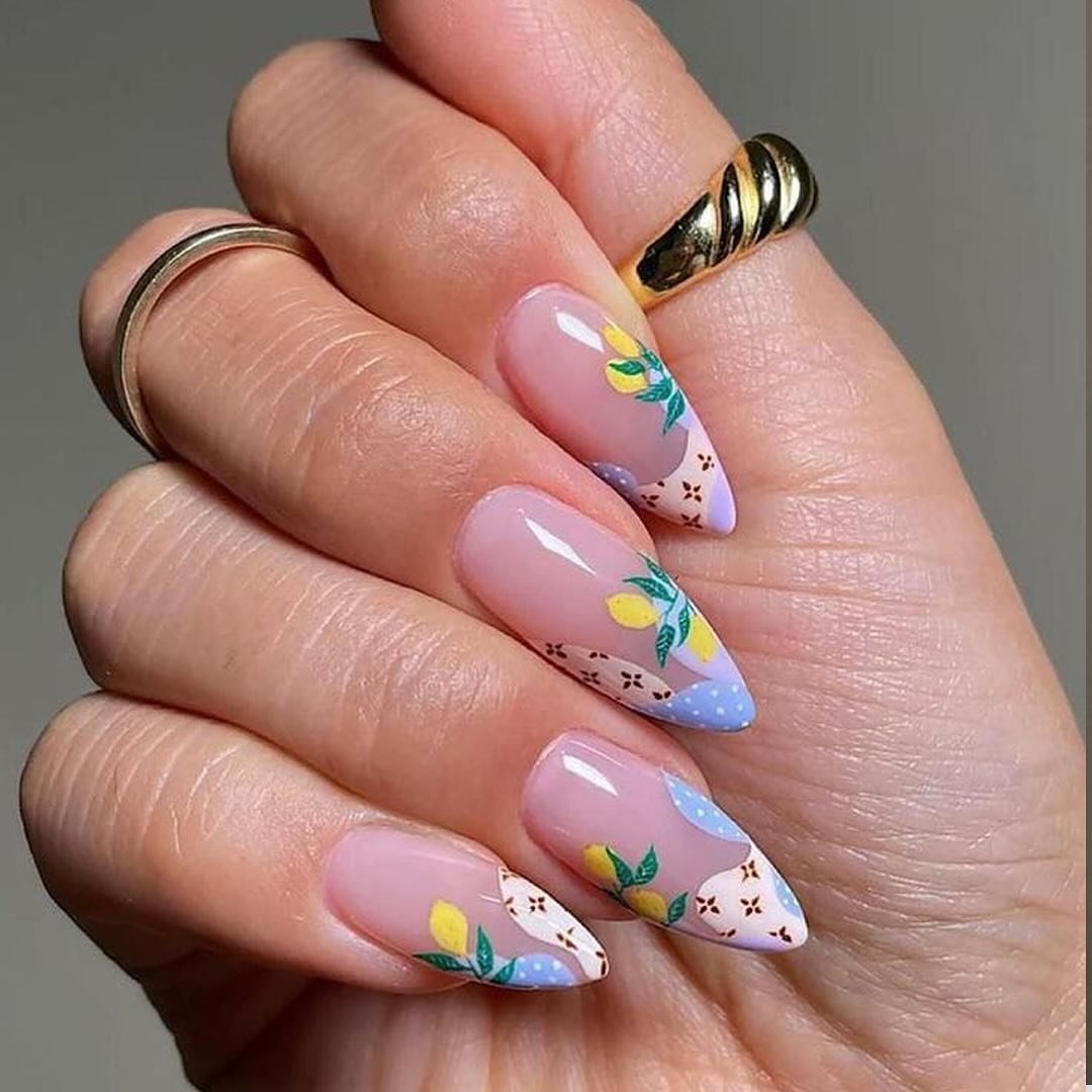 These nails feel like a tiny summer garden right at your fingertips. The soft nude base keeps things fresh while the lemon illustrations and pastel tips add a cheerful pop of color.