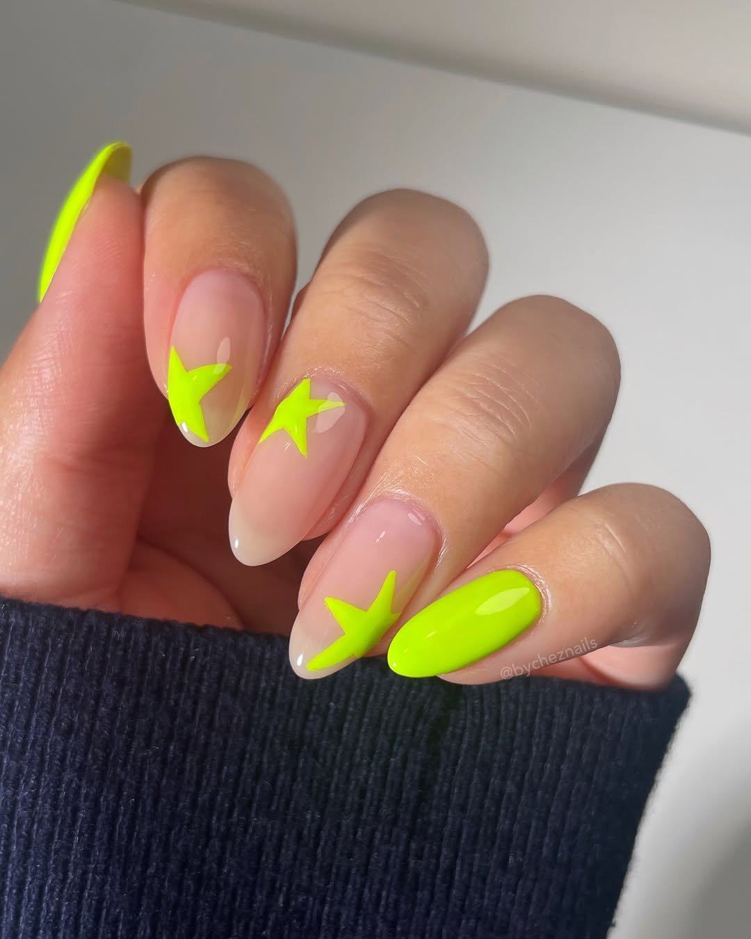 These nails are pure summer energy. The bright neon green stars instantly grab attention against the soft nude base, giving the manicure a cool, graphic feel.