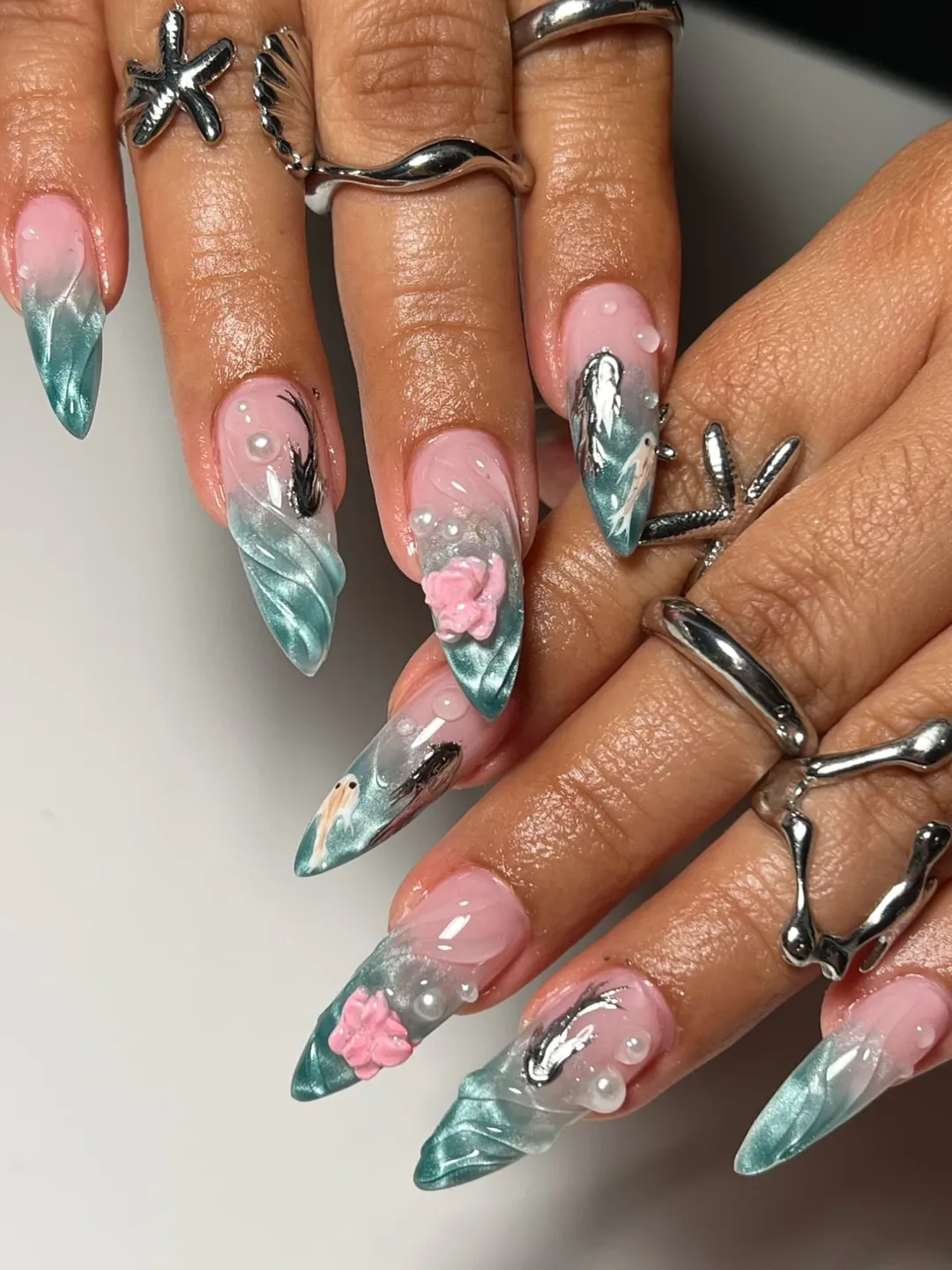 These nails feel like a little underwater fantasy brought to life. The soft pink base fades into shimmering teal tips, layered with pearls, chrome accents, and sculpted textures that almost mimic ocean waves.