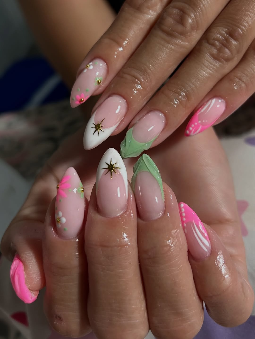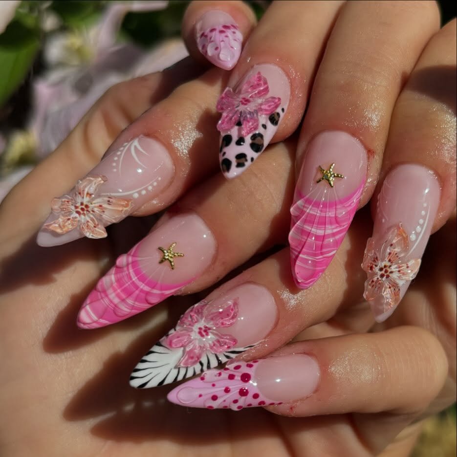 If fairytale nails were a thing, they’d probably look like this. The mix of pink swirls, delicate star accents, and detailed floral art makes the whole set feel dreamy and slightly magical.