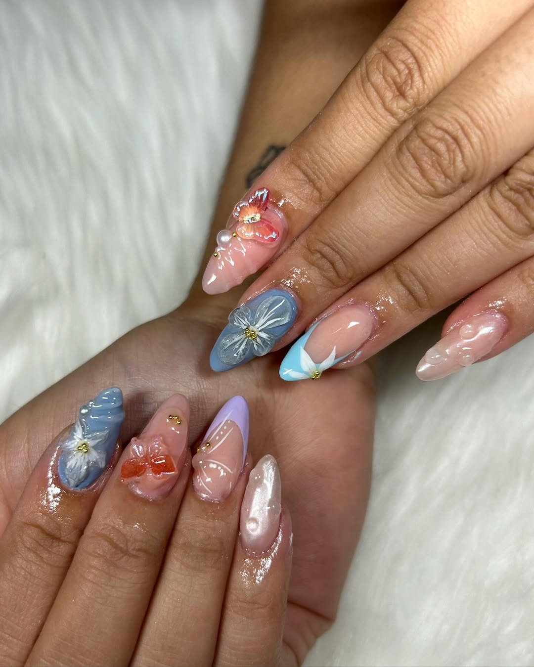 These nails look like tiny pastel sculptures. With 3D flowers, soft lilac, baby blue, and glossy neutral tones, the design feels almost like wearable nail art.