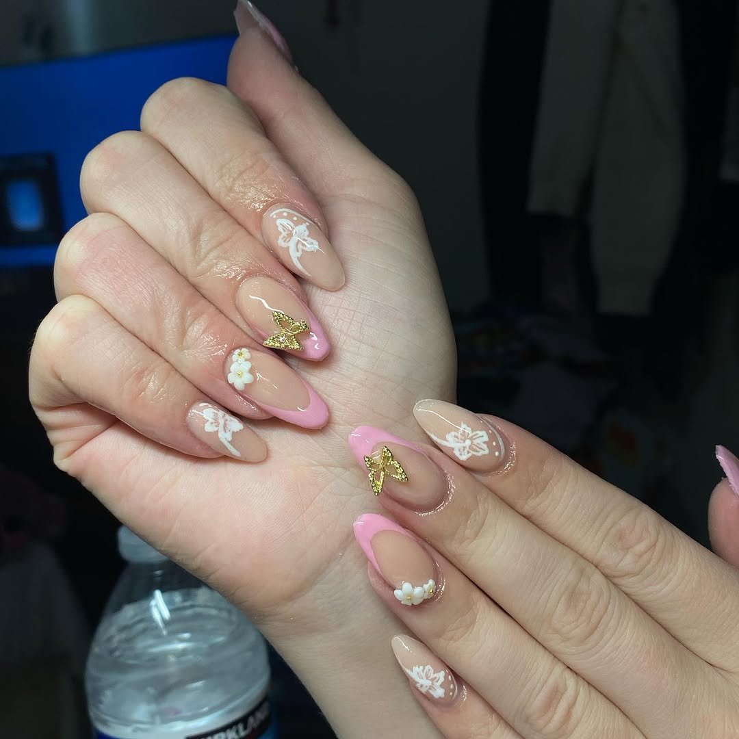 There’s a romantic softness to this set that’s hard to ignore. The nude base paired with blush pink French tips already looks beautiful, but those gold butterfly accents take it to another level.