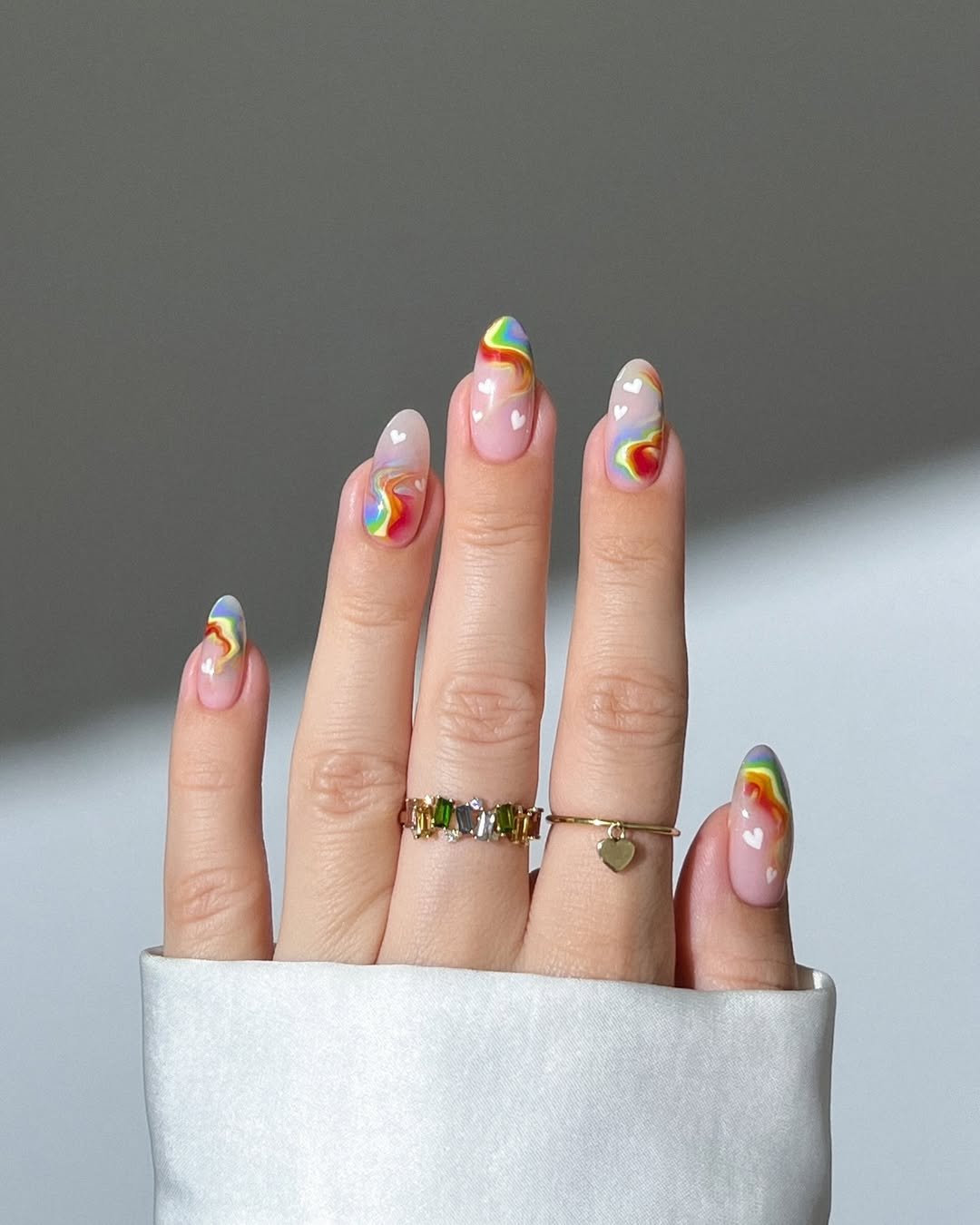 This set brings a dreamy, artsy twist to summer nails. Soft rainbow swirls flow across the almond tips while tiny white hearts add a playful, romantic detail.