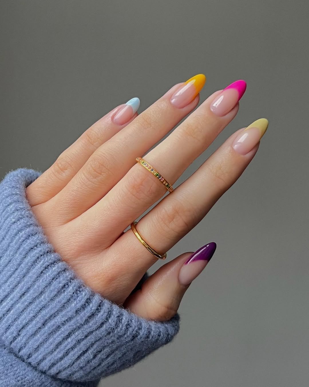 These nails are basically summer in color form. Each almond tip gets its own bright shade—from bubblegum pink to citrus orange and cool sky blue—giving the whole manicure a fun, candy-like vibe.