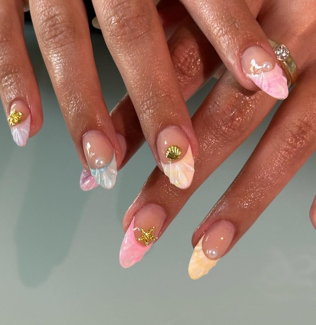 This set feels straight out of a beach vacation. Soft pink bases meet sculpted shell details and tiny gold sea accents that instantly give the nails a coastal vibe.