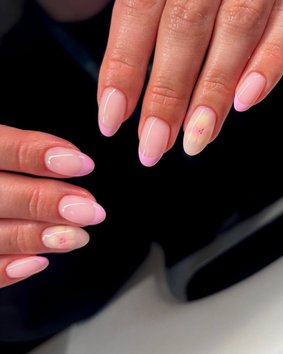 This set leans into that soft, dreamy aesthetic with baby pink French tips and barely-there floral details. It’s delicate, polished, and incredibly easy to wear.
