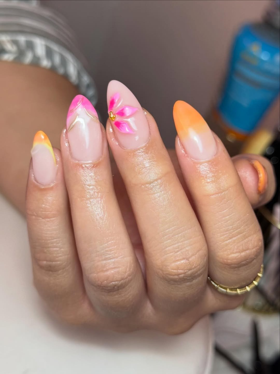Soft nude nails get a playful upgrade here with neon pink and warm orange gradient tips. The tiny floral accent in the center brings everything together beautifully.