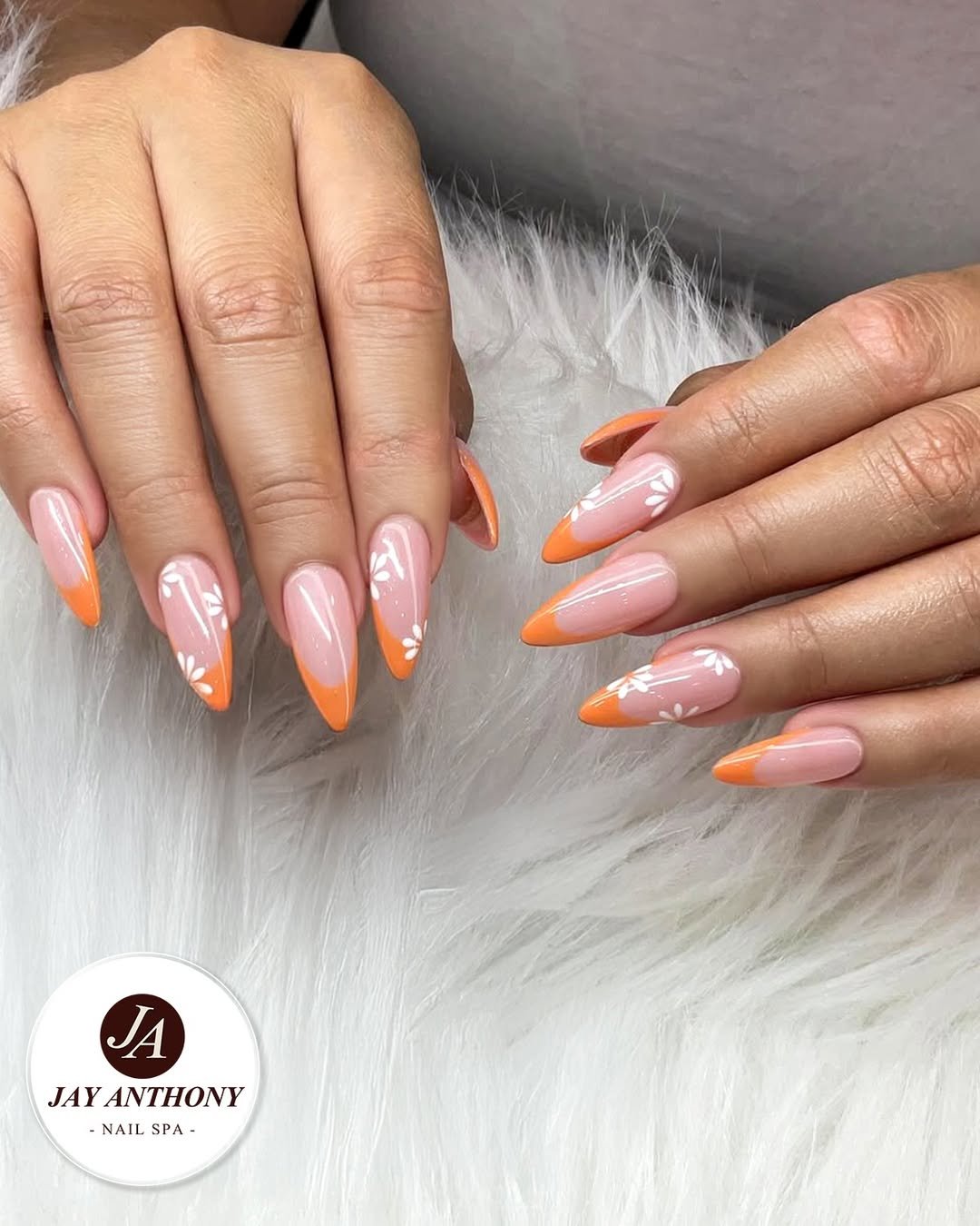 There’s something effortlessly chic about a bright orange French tip in summer. The vivid tangerine edges paired with delicate white floral accents keep the design looking clean yet playful.