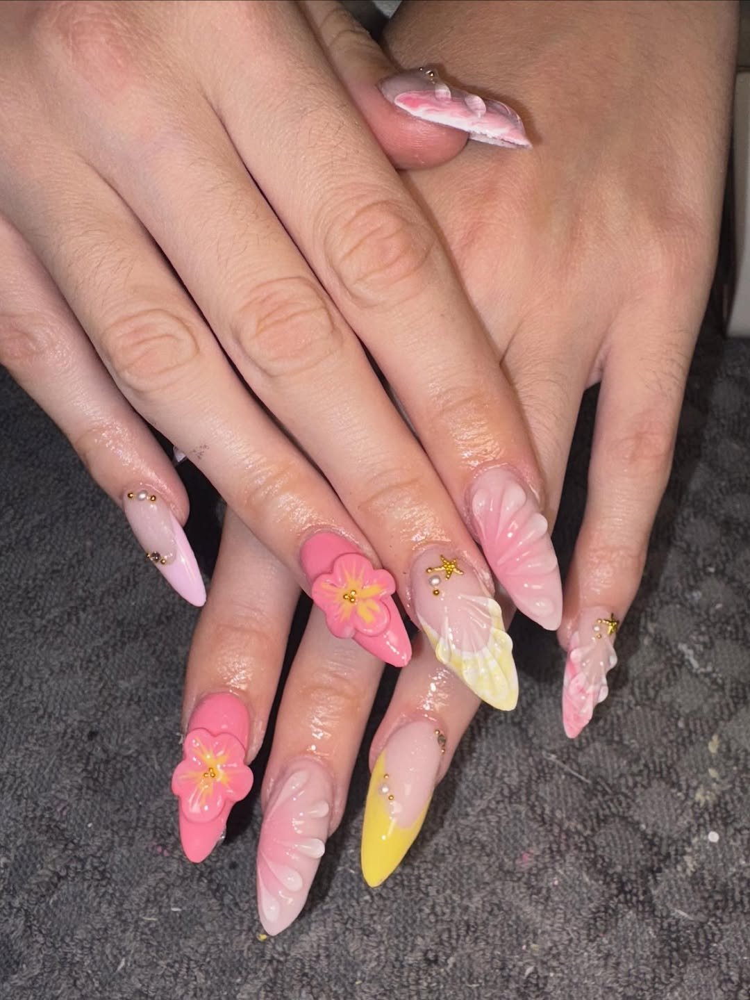 This set is full-on summer drama in the best way. Between the sculpted flowers, glossy petals, and vibrant pink and yellow accents, every nail feels like its own little tropical artwork.