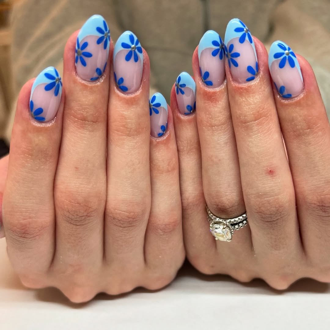 Classic French tips take a turn with sky blue edges and scattered daisy accents that feel light and carefree. The negative space keeps everything breathable, letting the details stand out.