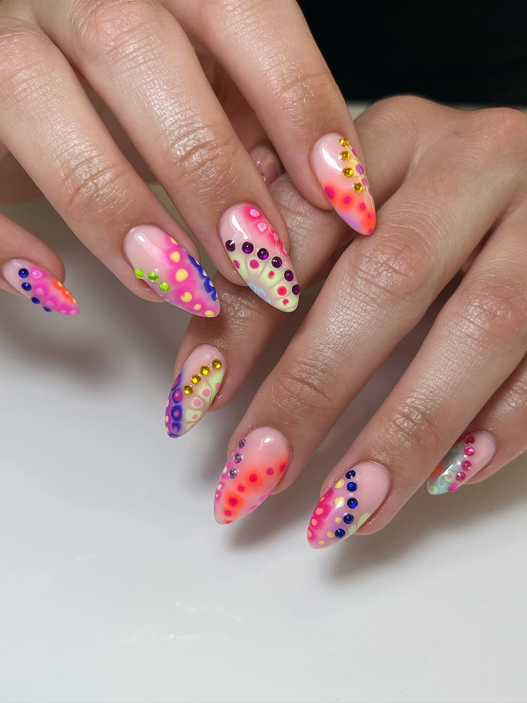 A soft ombré base layered with tiny, jewel-like dots in rainbow tones creates a look that feels almost like confetti caught mid-air. The scattered gems add a bit of sparkle without overwhelming the design.