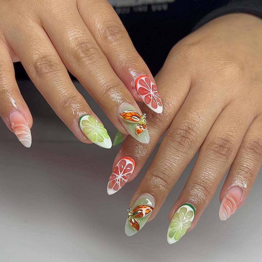 Lime and grapefruit tones meet crisp white tips and tiny gem accents that almost feel like jewelry placed onto each nail. The fruit-inspired details bring in a playful, juicy edge.