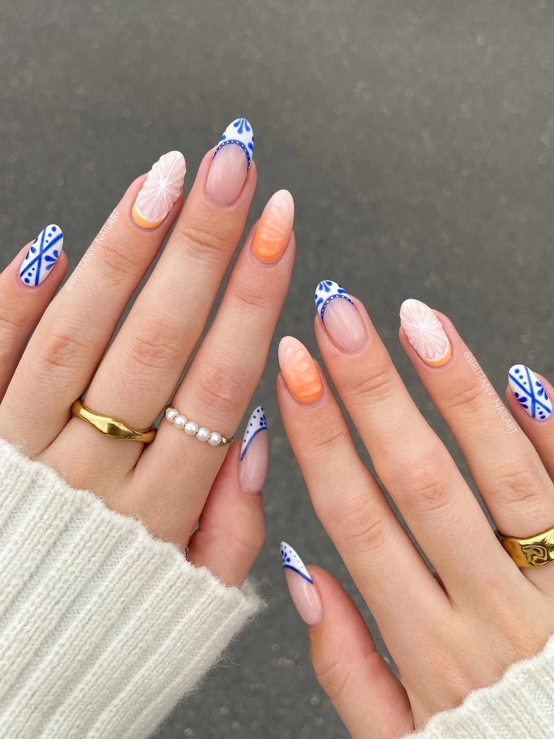 Bright citrus slices meet crisp blue patterns, creating a look that feels like a Mediterranean table setting translated onto nails. The contrast between the soft nude base and those detailed tips keeps everything fresh and clean.