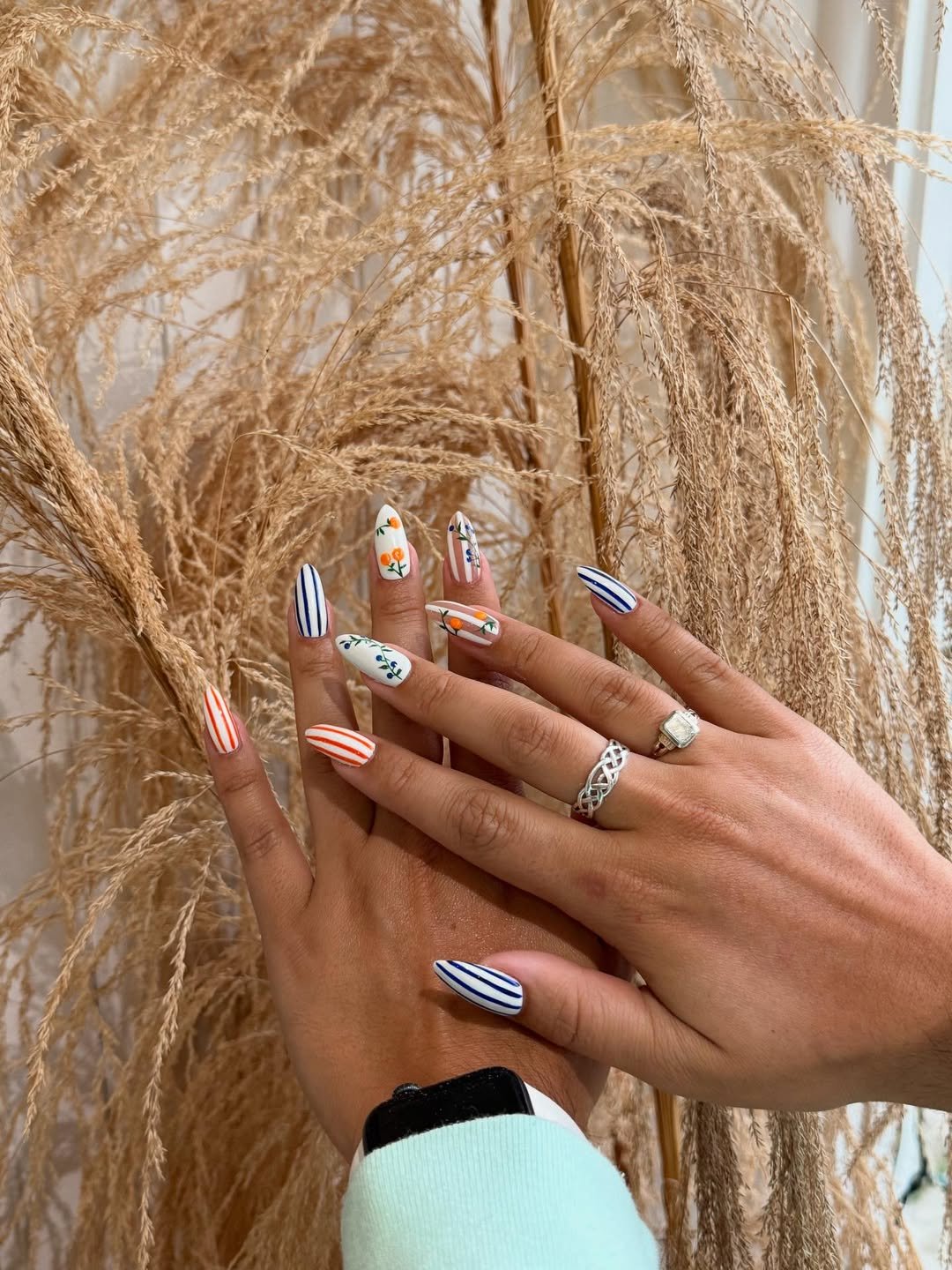 Tiny oranges scattered over a soft, dusty blue base feel like a quiet nod to Mediterranean summers. The painterly leaves add just enough contrast, giving each nail that hand-touched charm.