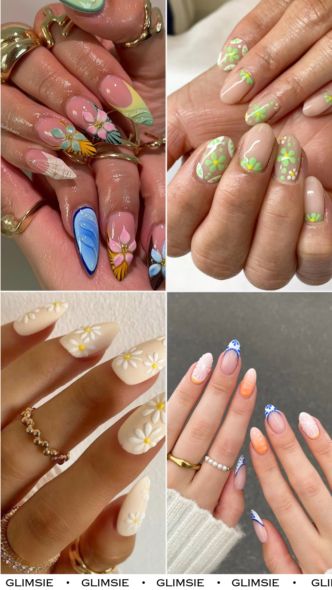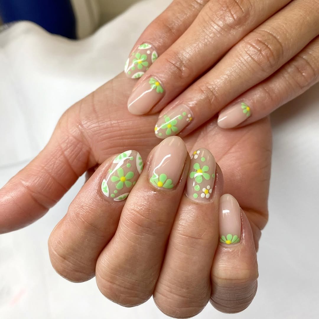 Muted nude bases with tiny green and white florals feel calm and grounded, almost like wildflowers scattered across a quiet field. The palette stays soft, letting the details shine gently.