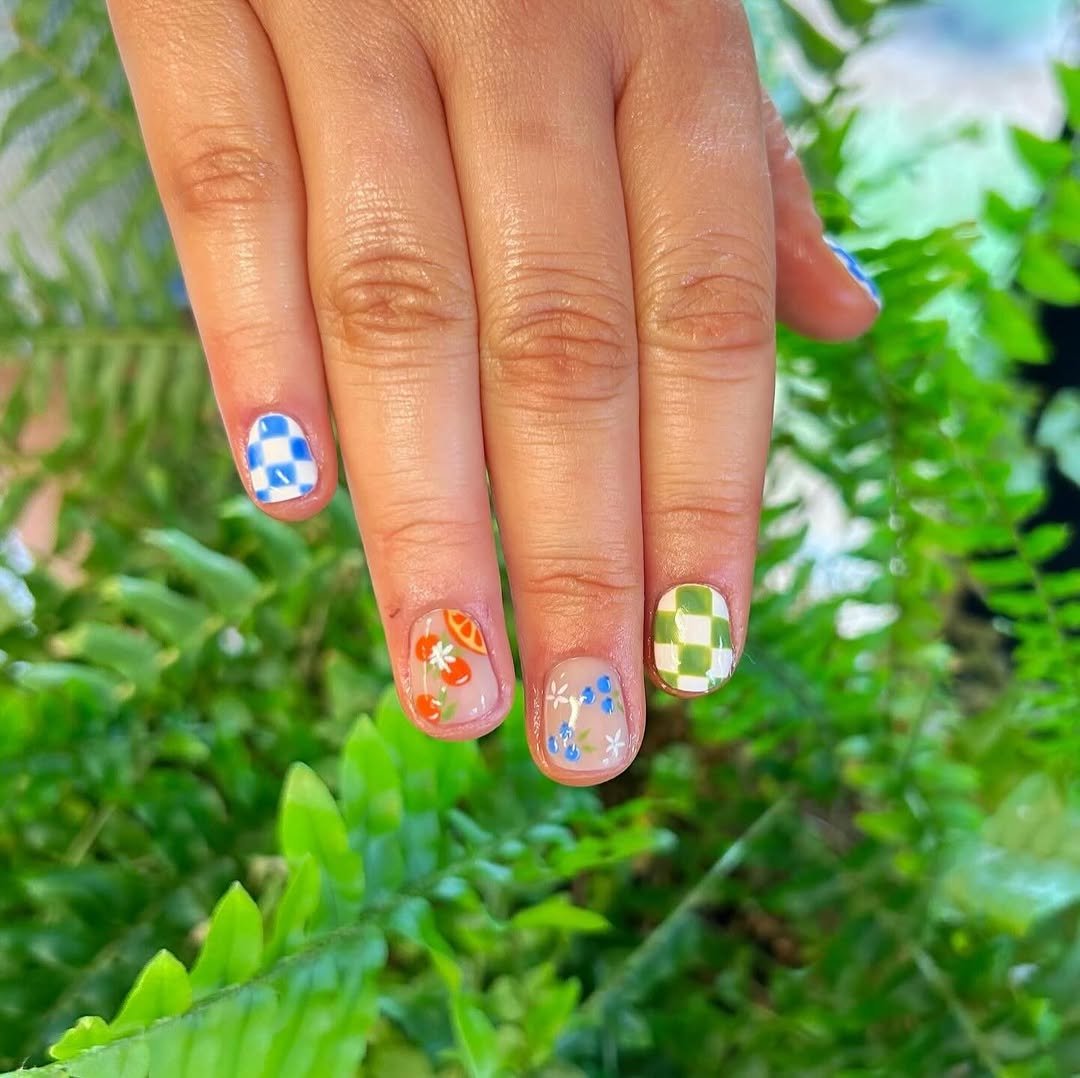 Tiny florals, fruit accents, and soft checkerboard patterns come together in a playful mix that feels straight out of a summer picnic. Each nail tells its own little story.