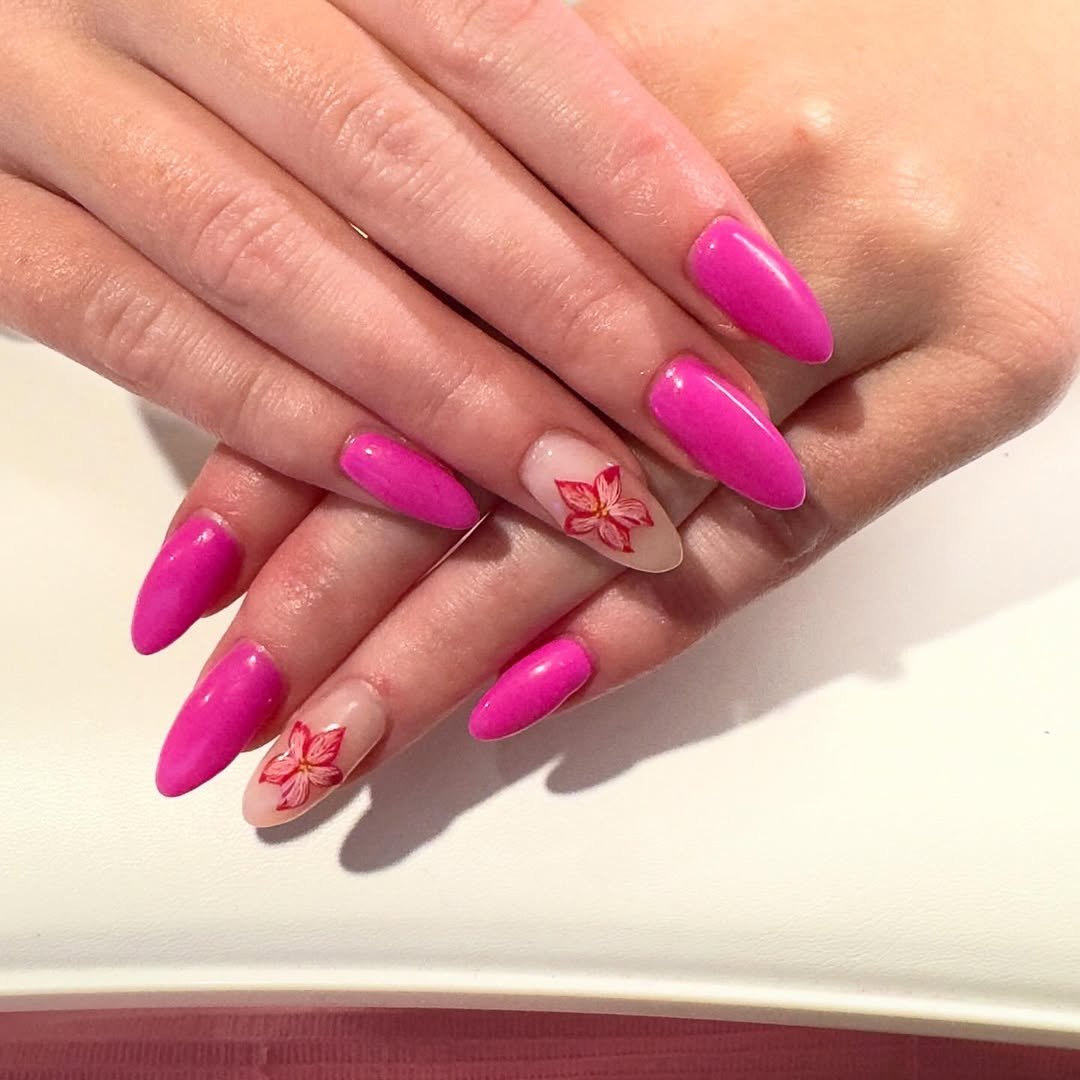 A saturated pink takes center stage, bold and unapologetic, softened just slightly by a single floral accent that breaks up the color with a touch of hand-painted charm.