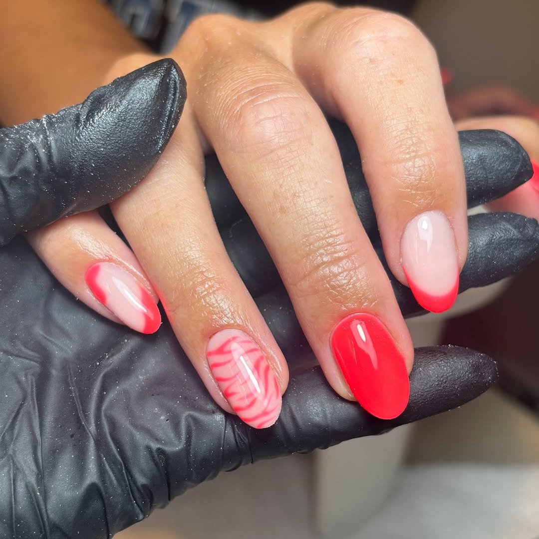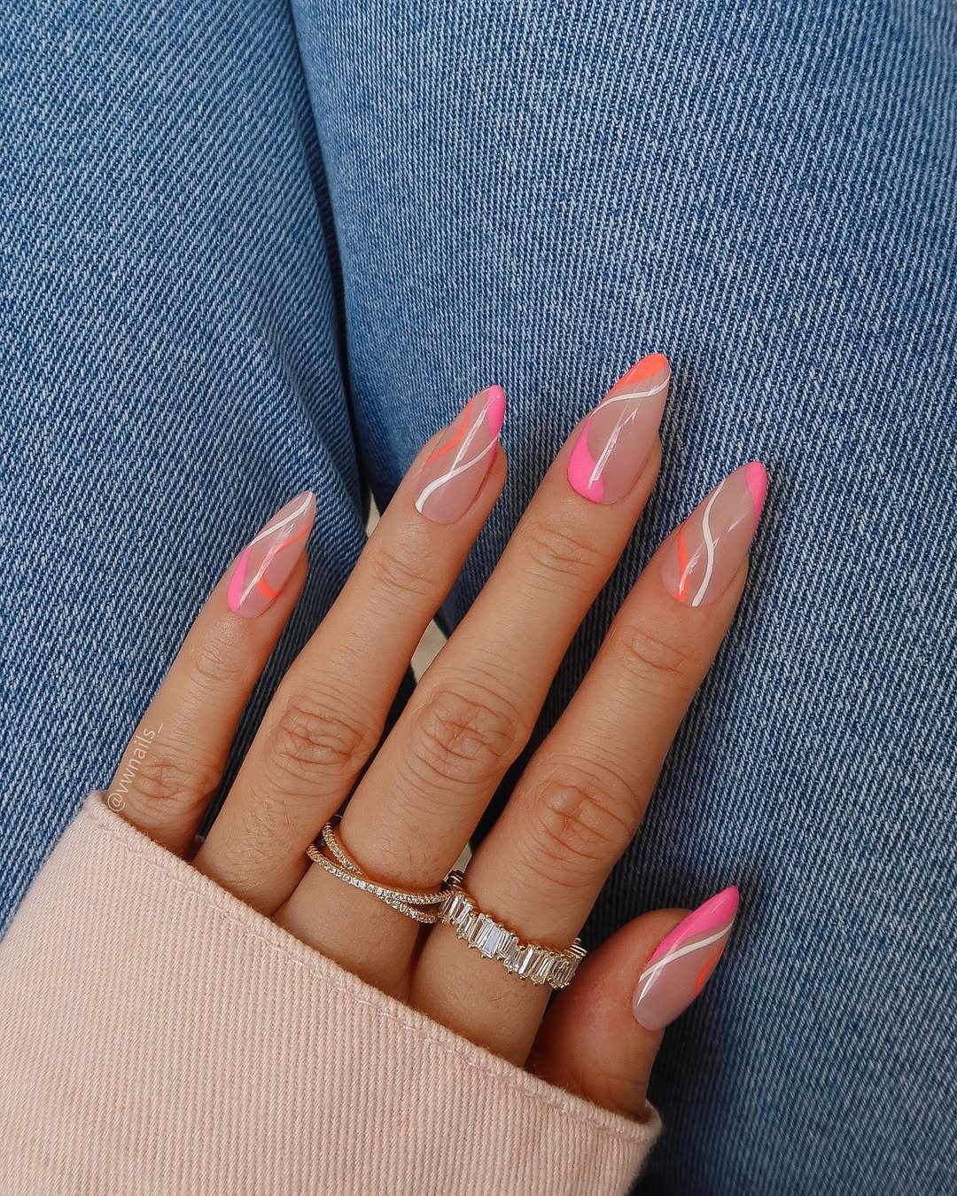 Sheer nude nails accented with fluid lines of coral, pink, and soft white create a modern, almost abstract design. The lines curve gently, like light reflecting at golden hour.
