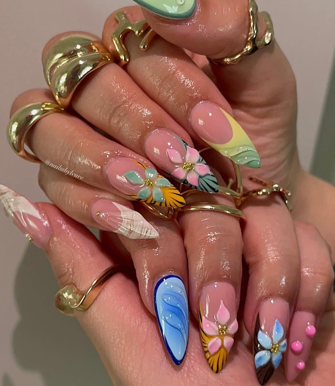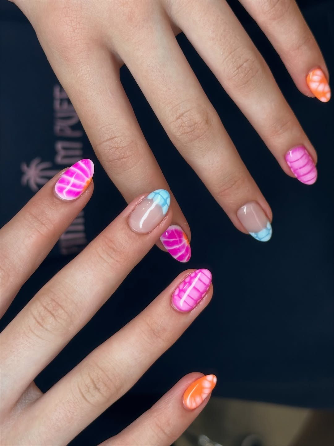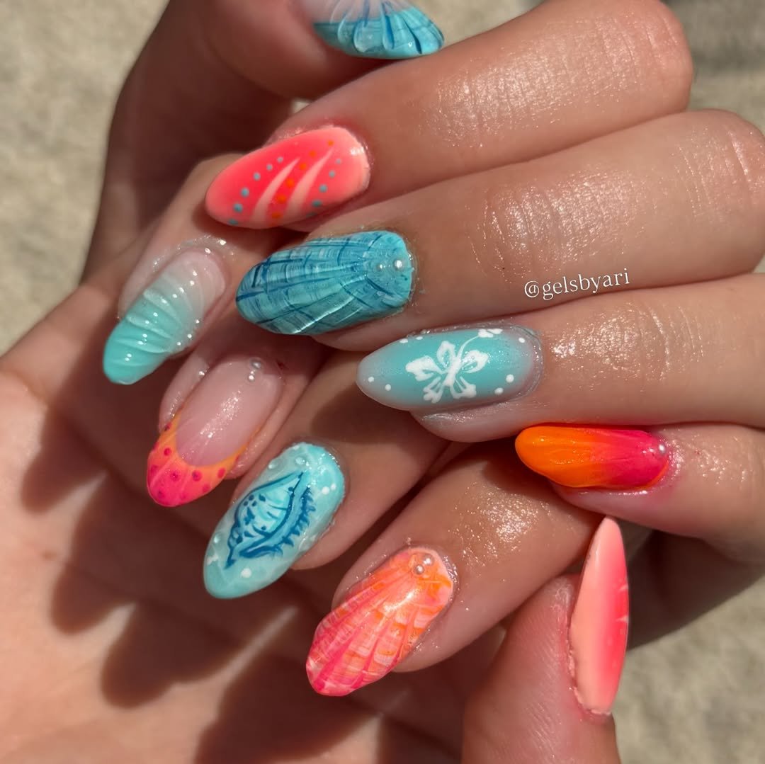Bright pinks, ocean blues, and soft corals come together in a playful mix of shell textures and color-blocked tips. Each nail feels like a different piece of a beach day.