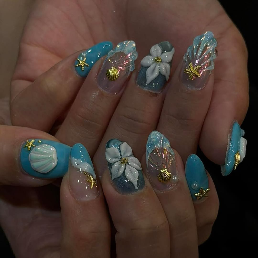 Deep aqua tones meet sculpted shells, gold accents, and tiny starfish that feel almost like jewelry placed onto each nail. The mix of matte and gloss textures adds depth without overwhelming the design.