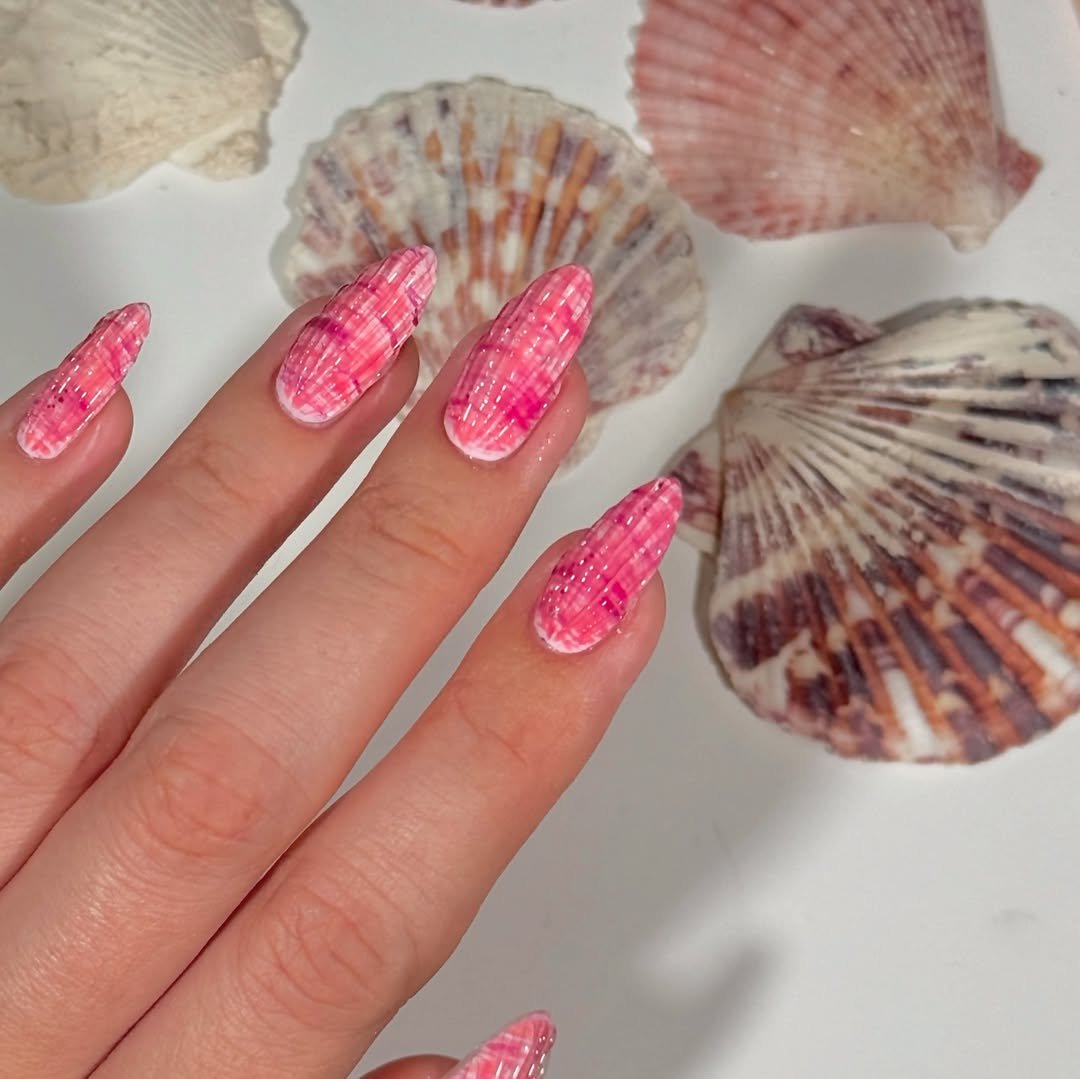 These feel like tiny seashells you’d pocket after a long beach walk, layered with soft pinks and a subtle ridged texture that catches the light in the prettiest way. The glossy finish adds just enough shine to keep them feeling fresh, not overworked.