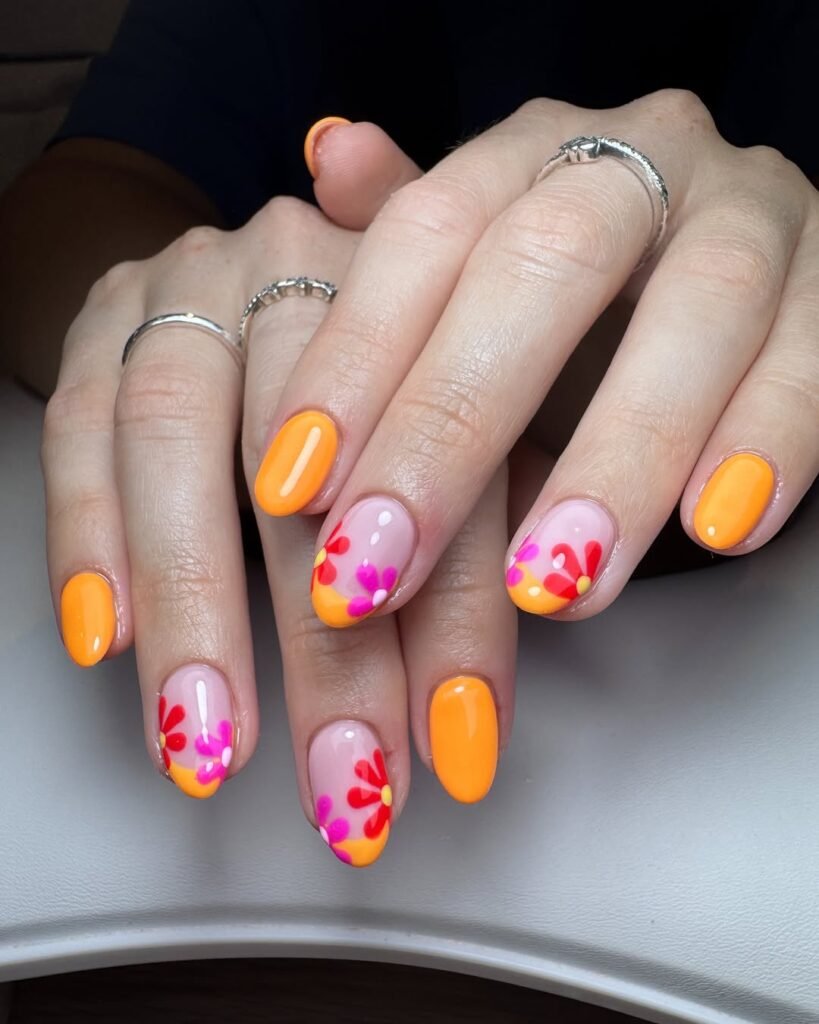 Bright orange paired with simple, bold flowers creates a look that leans into that retro summer mood. The glossy finish keeps everything feeling fresh and current.