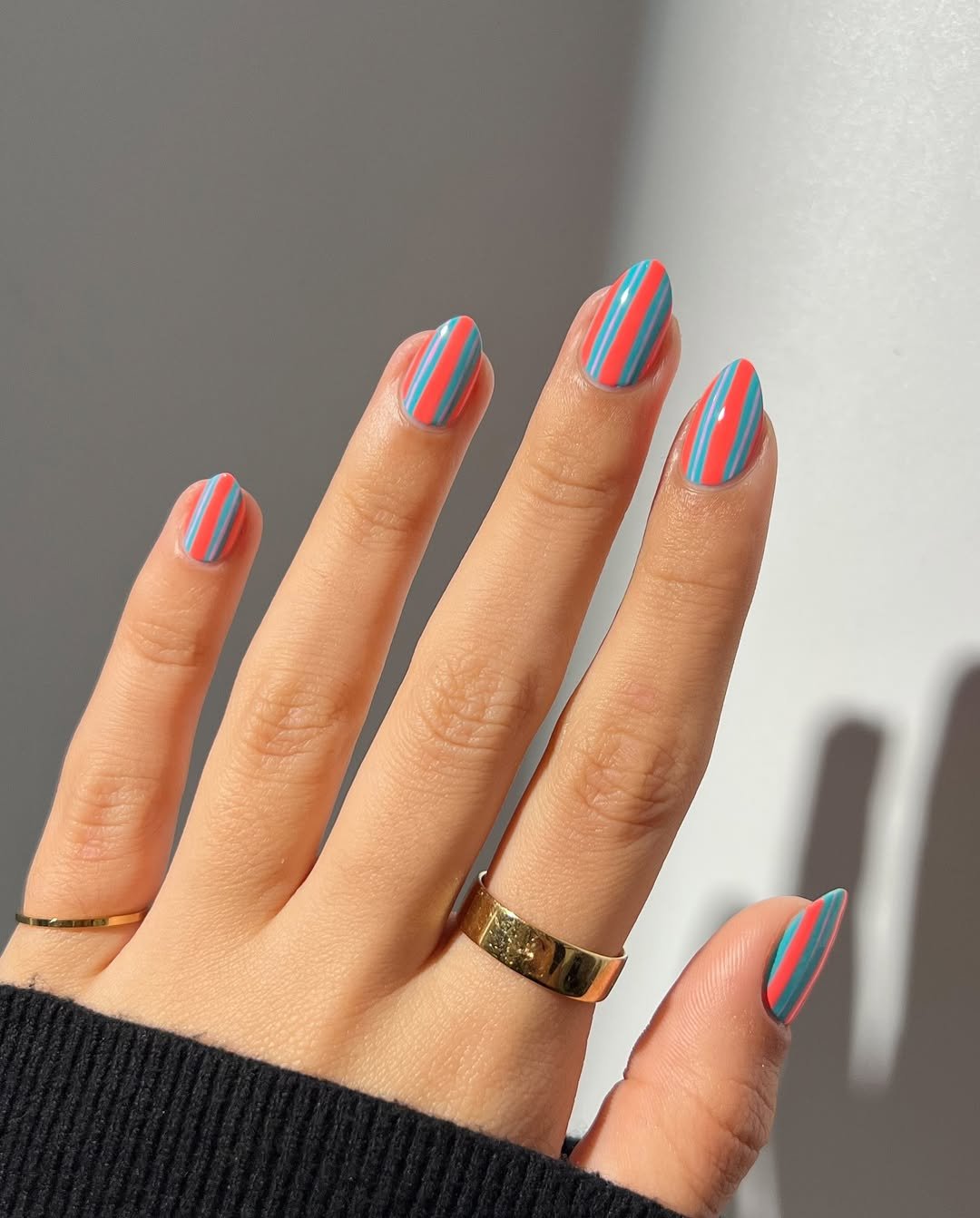 Bold coral and teal stripes run clean across each nail, creating a graphic look that feels both retro and fresh. The color pairing alone does all the heavy lifting.