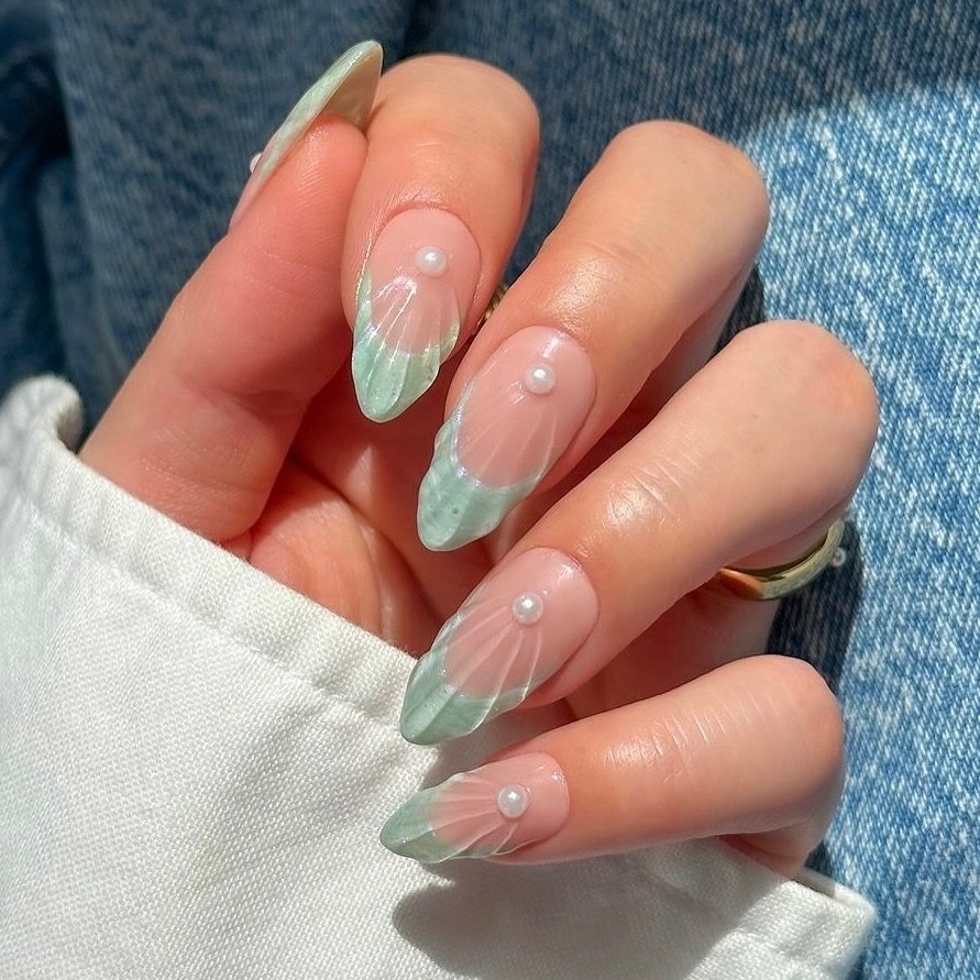 A sheer nude base melts into translucent seafoam tips, finished with a single pearl detail that feels quiet and intentional. The soft sculpted lines give that underwater shell effect without overwhelming the design.