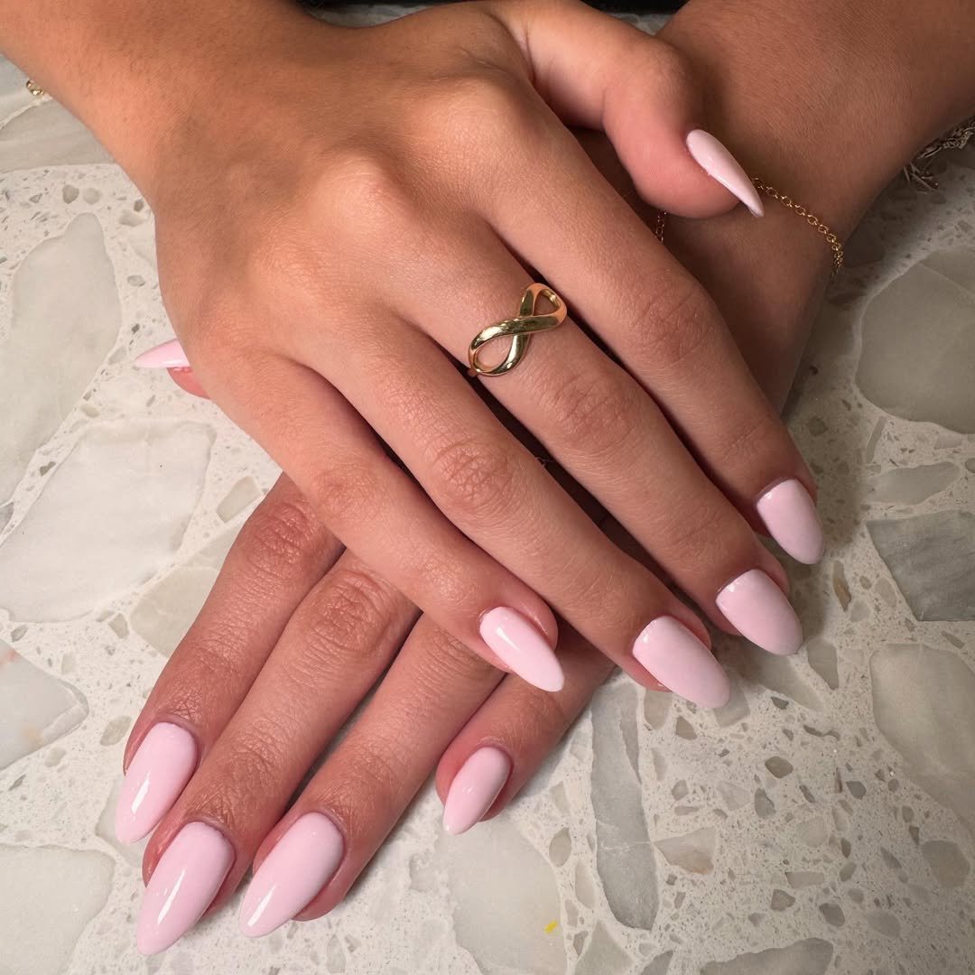 A clean, milky pink set with a glossy finish that almost melts into the skin. The almond shape keeps it elegant, while the color stays barely-there and polished.