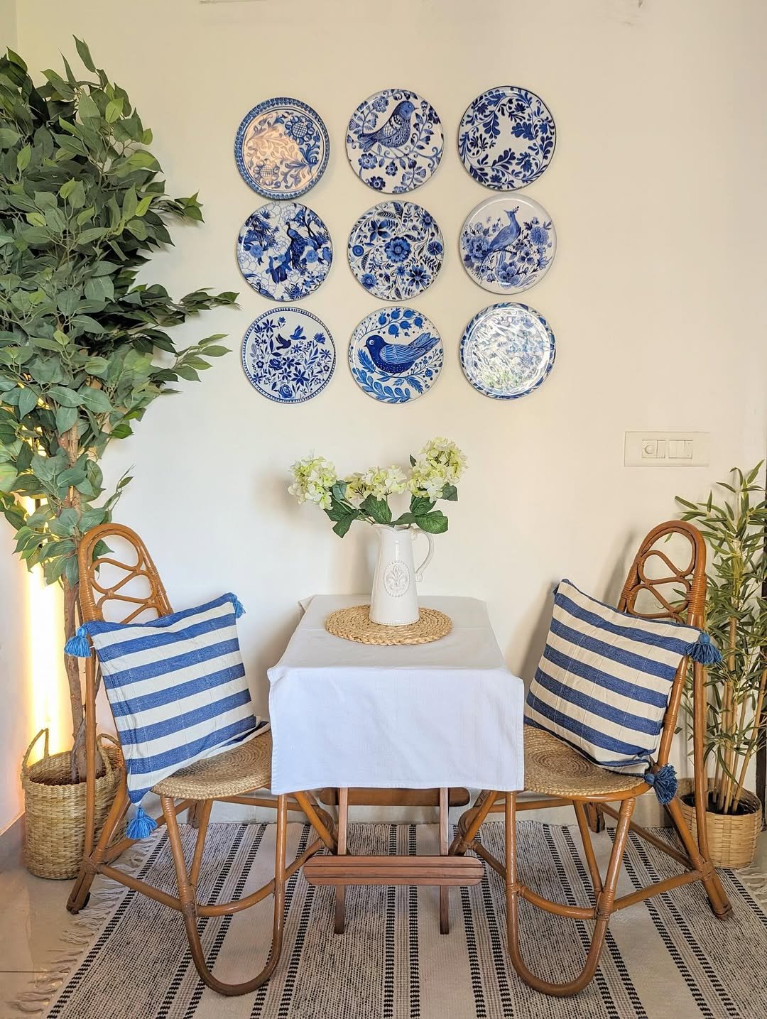 A tiny setup, but it carries so much charm. The woven chairs, striped cushions, and those classic blue plates create a moment that feels collected over time.