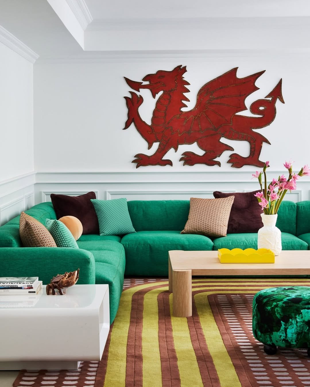 This one doesn’t hold back. A saturated green sofa, patterned rug, and that oversized red wall piece turn the room into something memorable right away.