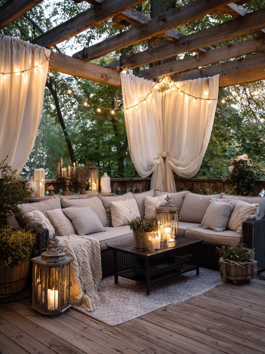 This is the kind of space that invites you to stay longer than planned. Draped curtains, warm string lights, and layered cushions create a cocoon that feels tucked away from everything else.