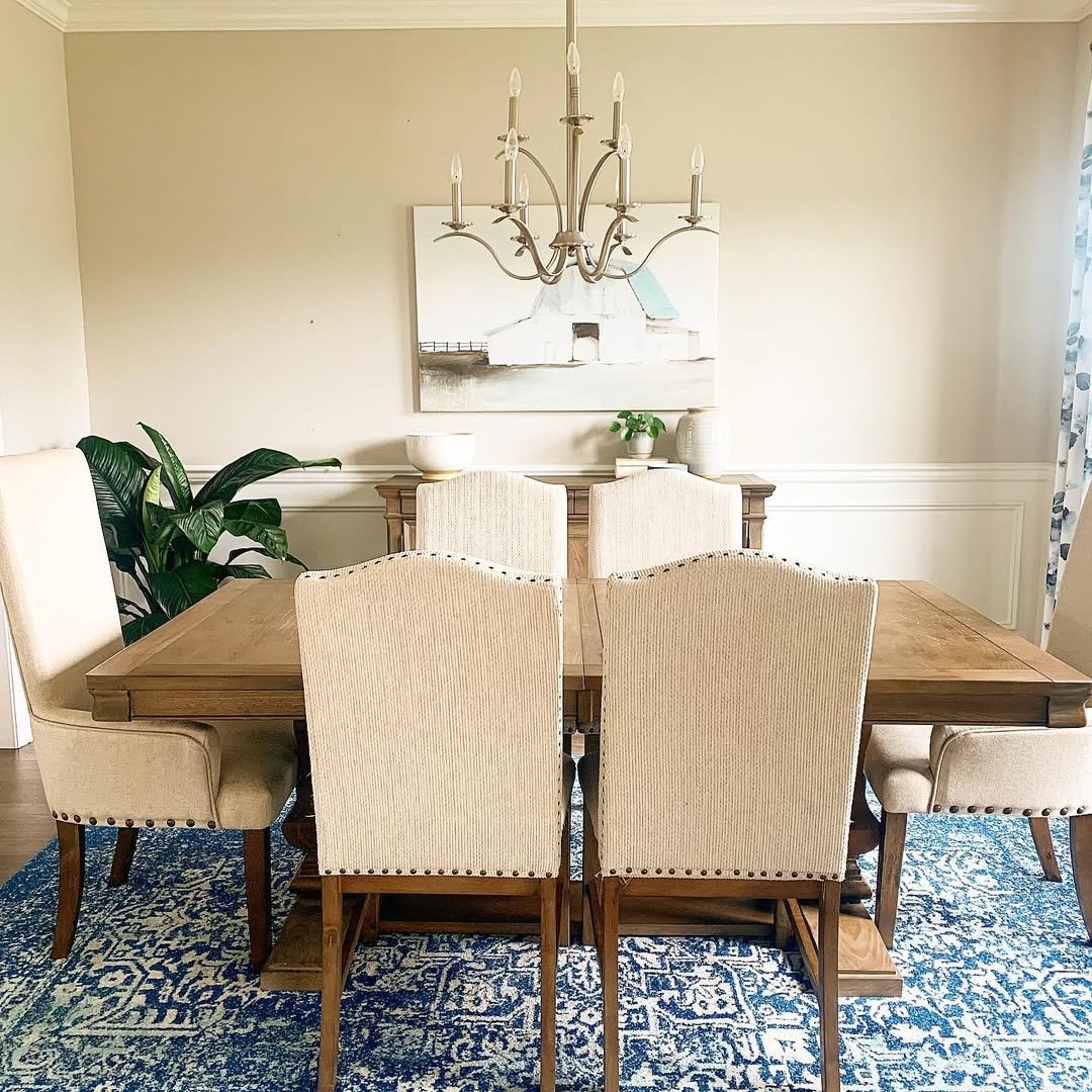 This dining room leans into simplicity, but it’s far from basic. Neutral chairs, a wood table, and a soft blue rug create a foundation that feels steady and inviting.