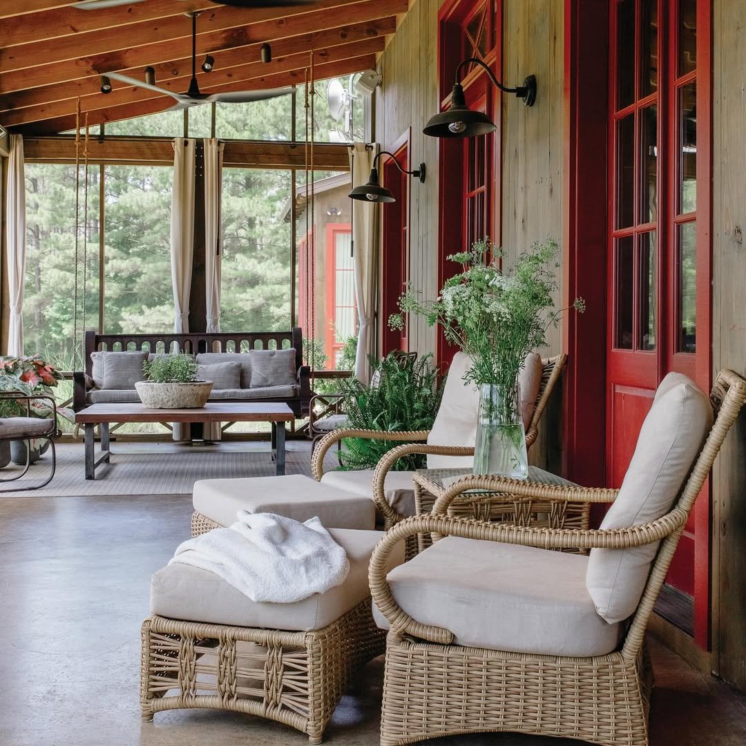 There’s something about a long porch with red-framed doors that just feels like summer. Wicker seating, soft cushions, and a simple table setup create a space that’s ready for slow mornings or late-night chats.