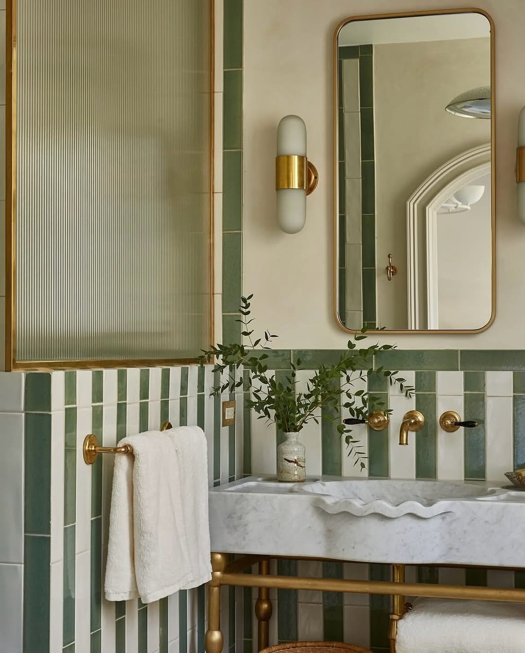 Green and white stripes bring a fresh, almost nostalgic feel to this bathroom. Paired with warm brass fixtures and a marble sink, it lands somewhere between classic and playful.