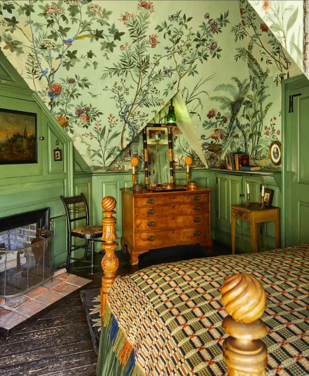 This room pulls you in immediately. Rich green paneling and intricate botanical walls create a space that feels almost like a hidden garden indoors.
