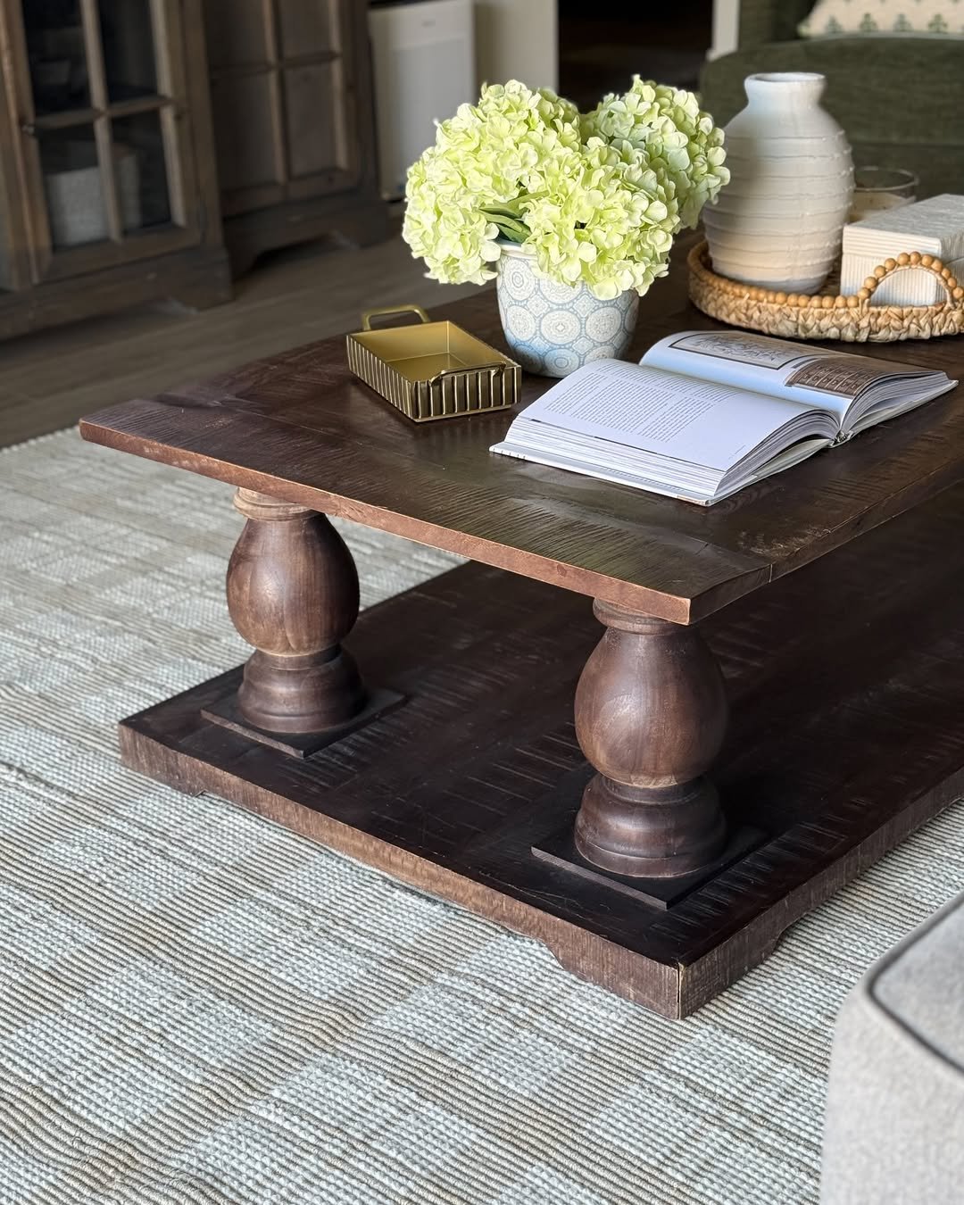 A low wooden table, a stack of pages mid-read, and a bowl of hydrangeas that feel almost too perfect. It’s relaxed but intentional, like someone styled it and then walked away to actually enjoy the space.