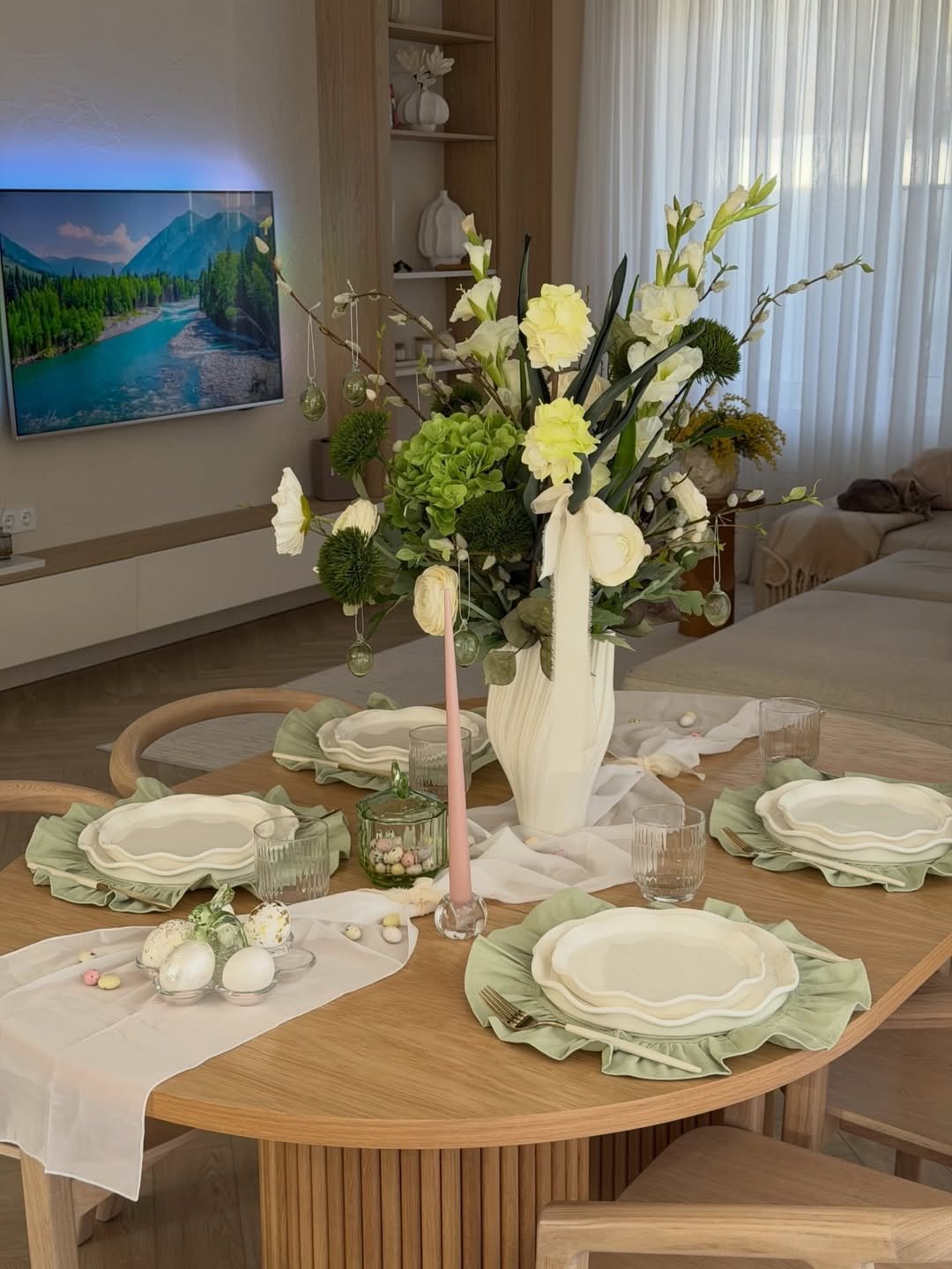 There’s a gentle rhythm to this table setting. Pale greens, creamy ceramics, and a loose linen runner create a look that feels almost weightless, like it could shift with a breeze.