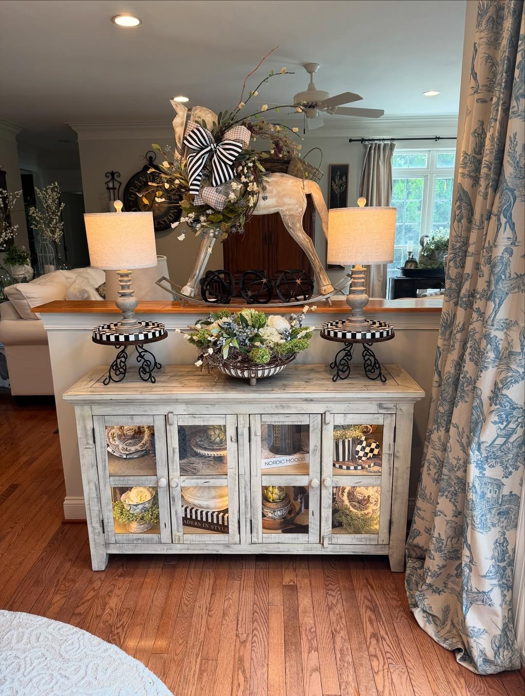 This vignette feels like a snapshot of a well-loved home. A mix of florals, lamps, and collected pieces layered across a simple console.