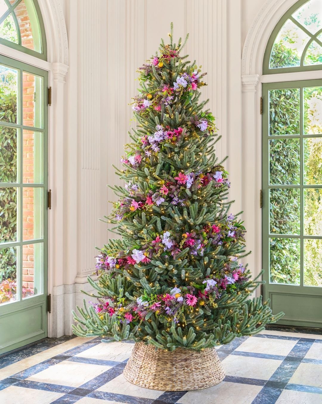 Who says Christmas trees get all the magic? This one feels like it stepped straight out of a midsummer garden party, layered with soft florals in pink, lilac, and butter yellow. Set against those arched windows and sunlit floors, it becomes less of a holiday piece and more of a seasonal statement.