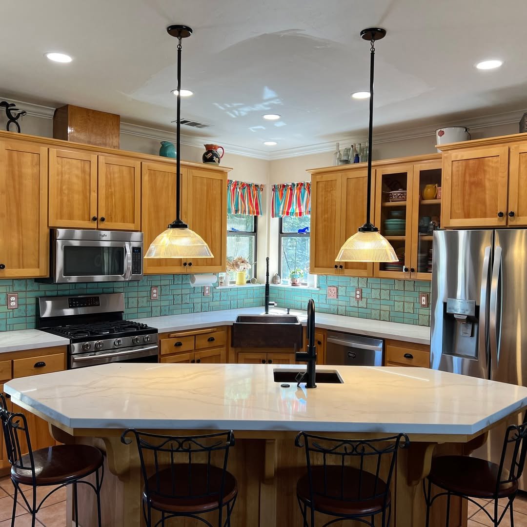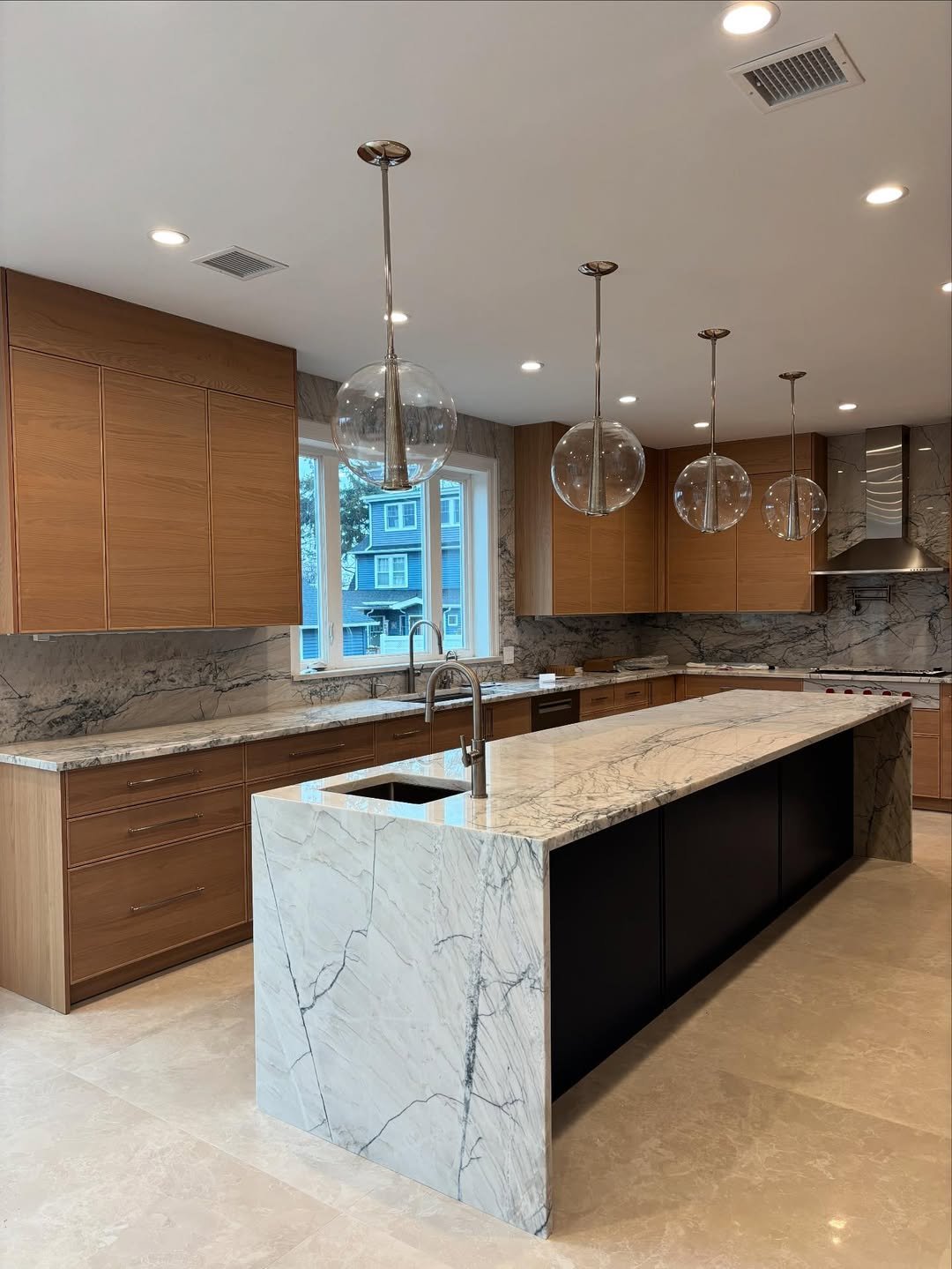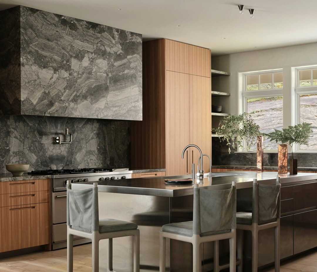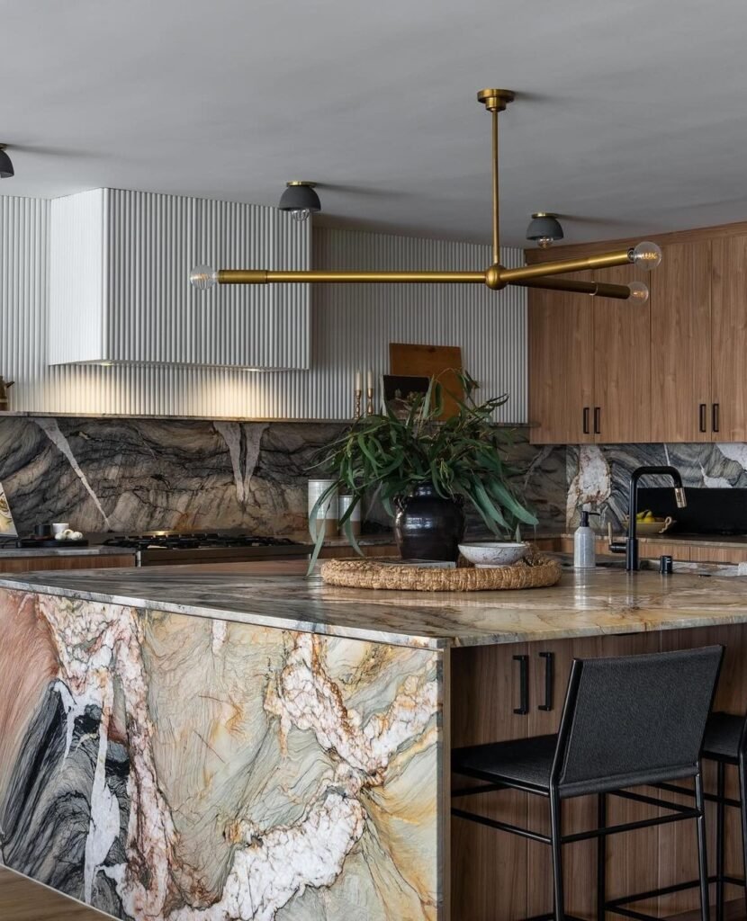 There’s a quiet drama in this kitchen that feels perfect for summer evenings that stretch a little longer. The veined stone backsplash anchors the space, while the warm wood cabinetry softens everything, creating a balance that feels grounded but not heavy.