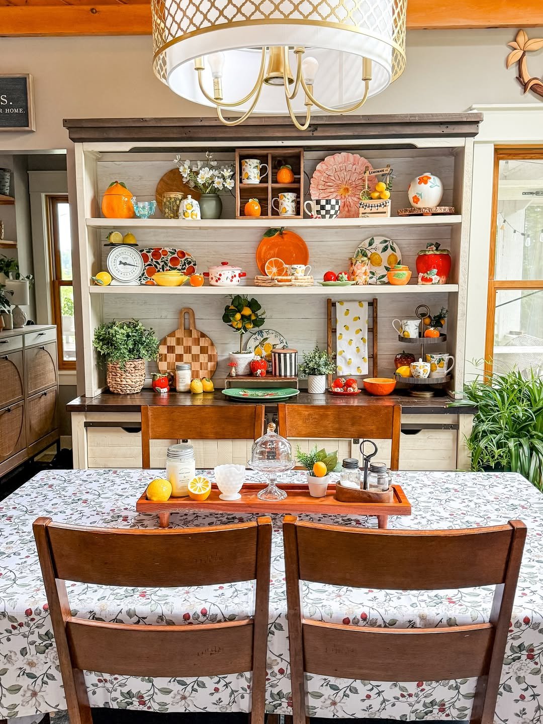 This setup is pure joy. Bright oranges, lemons, and playful ceramics fill each shelf with a sense of energy that feels almost contagious. It’s bold, but in a way that still feels homey.