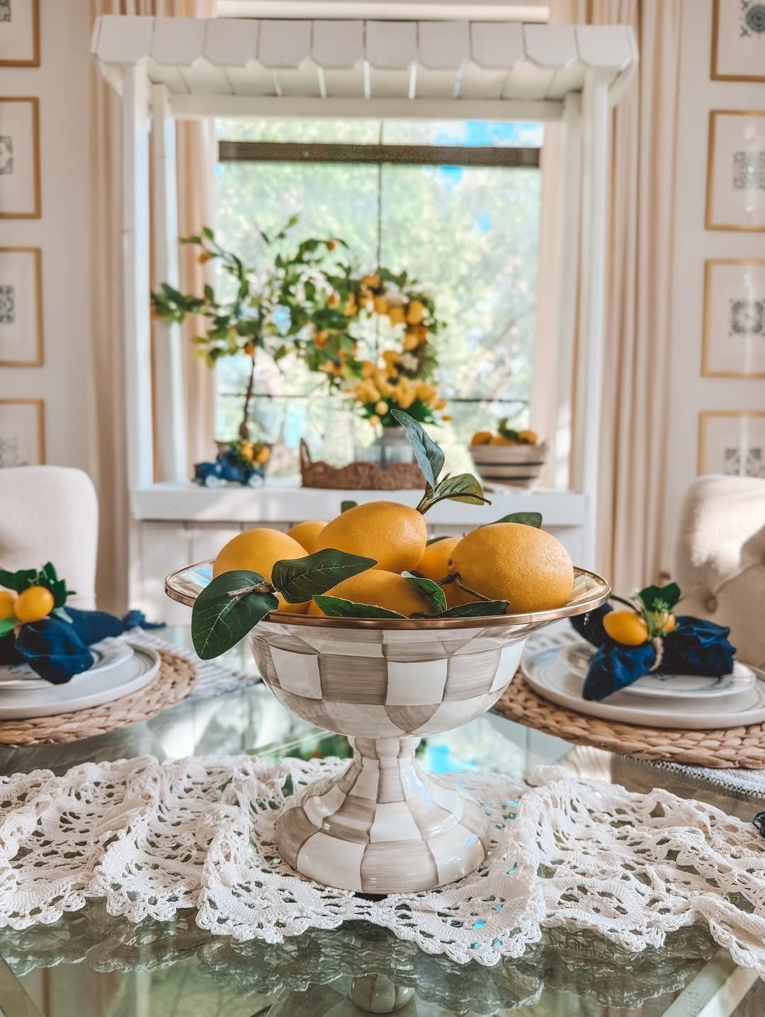 There’s something about lemons that instantly signals summer, and this table leans into that feeling beautifully. The glass bowl, the lace runner, and the soft natural light all work together to create a scene that feels fresh and inviting.