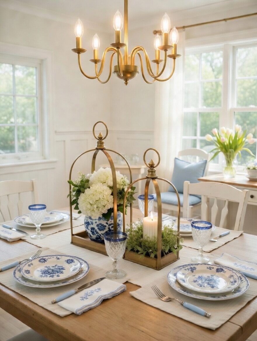 There’s something timeless about blue and white, especially when paired with soft linens and warm wood. The brass lanterns add a hint of structure while still keeping things relaxed.
