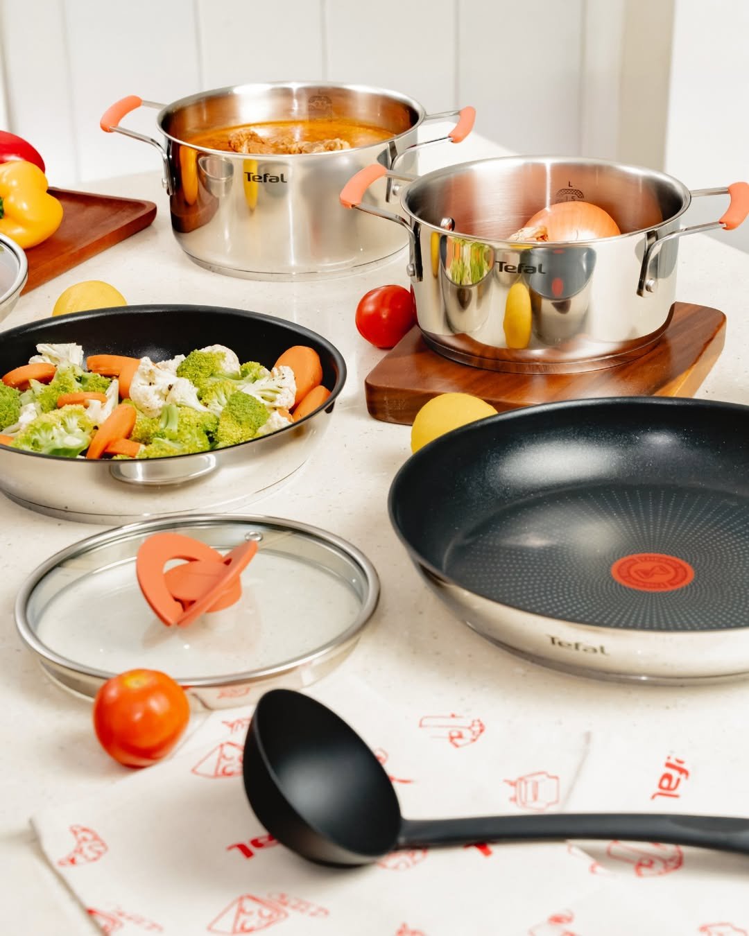 There’s something satisfying about a clean, functional setup done right. Stainless steel pots, matte black pans, and those soft coral handles add just enough personality without distracting from the purpose.