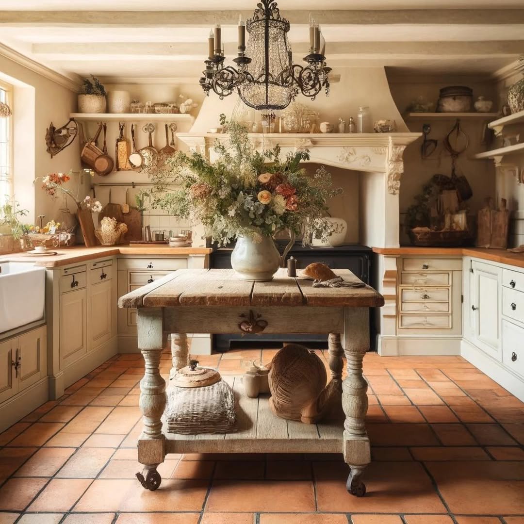 This kitchen feels like it holds stories. The worn wood island, terracotta floors, and that ornate chandelier create a space that feels layered with time, not trends. Fresh florals spilling from a simple vase soften the structure and bring in that quiet, romantic energy.