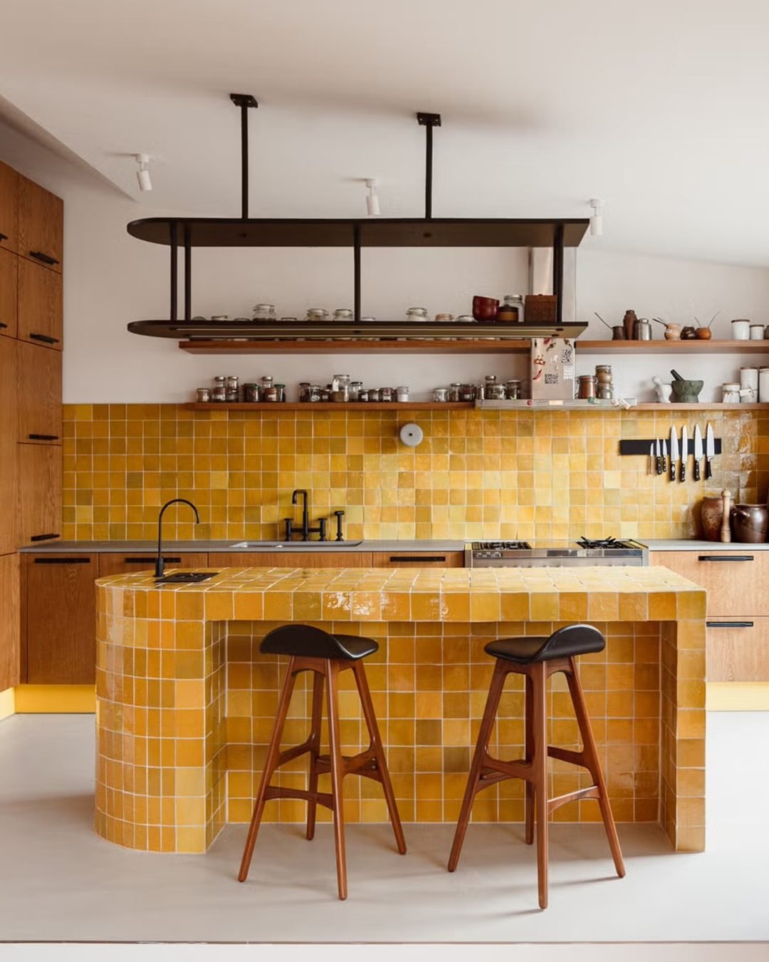 This kitchen feels like it’s bathed in sunlight, even when it’s not. The golden tiles reflect light in a way that adds warmth and depth, turning the entire space into a glowing backdrop.
