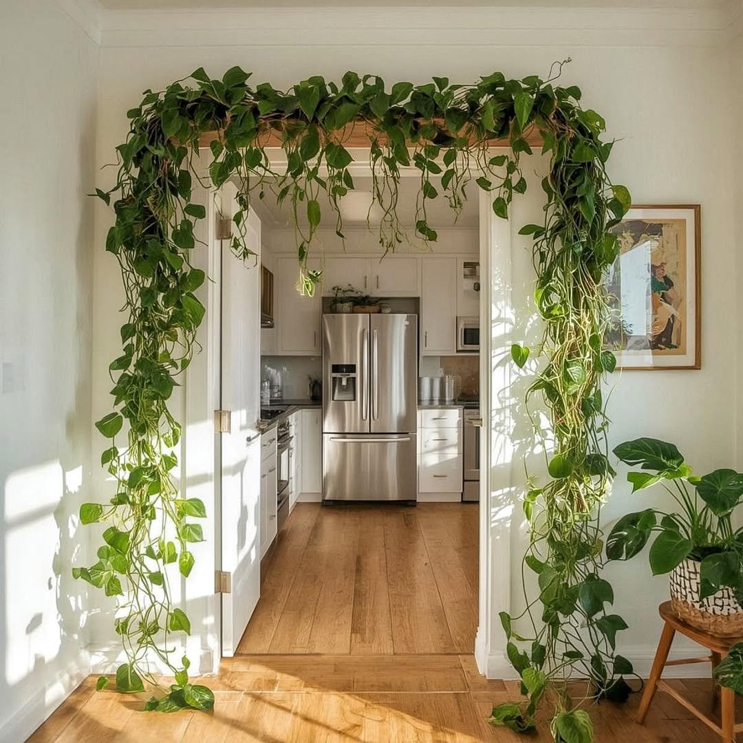 Sometimes the transition into the kitchen matters just as much as the kitchen itself. This doorway wrapped in cascading greenery creates a soft, organic frame that feels alive.