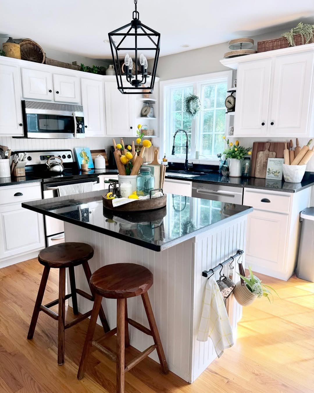 A bowl of lemons, a cluster of wooden utensils, and a few glass jars, it’s simple, but it works. The contrast of crisp white cabinetry with black countertops gives everything a clean backdrop to shine against.
